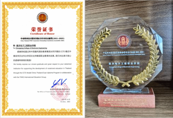 会议总结了中泰职业教育合作以来所取得的成就,同时表彰了近年来在中泰职业教育合作领域做出突出贡献的院校。其中,我校荣获2021-2023中泰职业技术教育国际合作突出贡献奖。该奖项是泰国教育部职业教育委员会认定的国家级奖项,由泰国教育部职业教育委员会副秘书长宋鹏·班丹先生亲自颁发。
