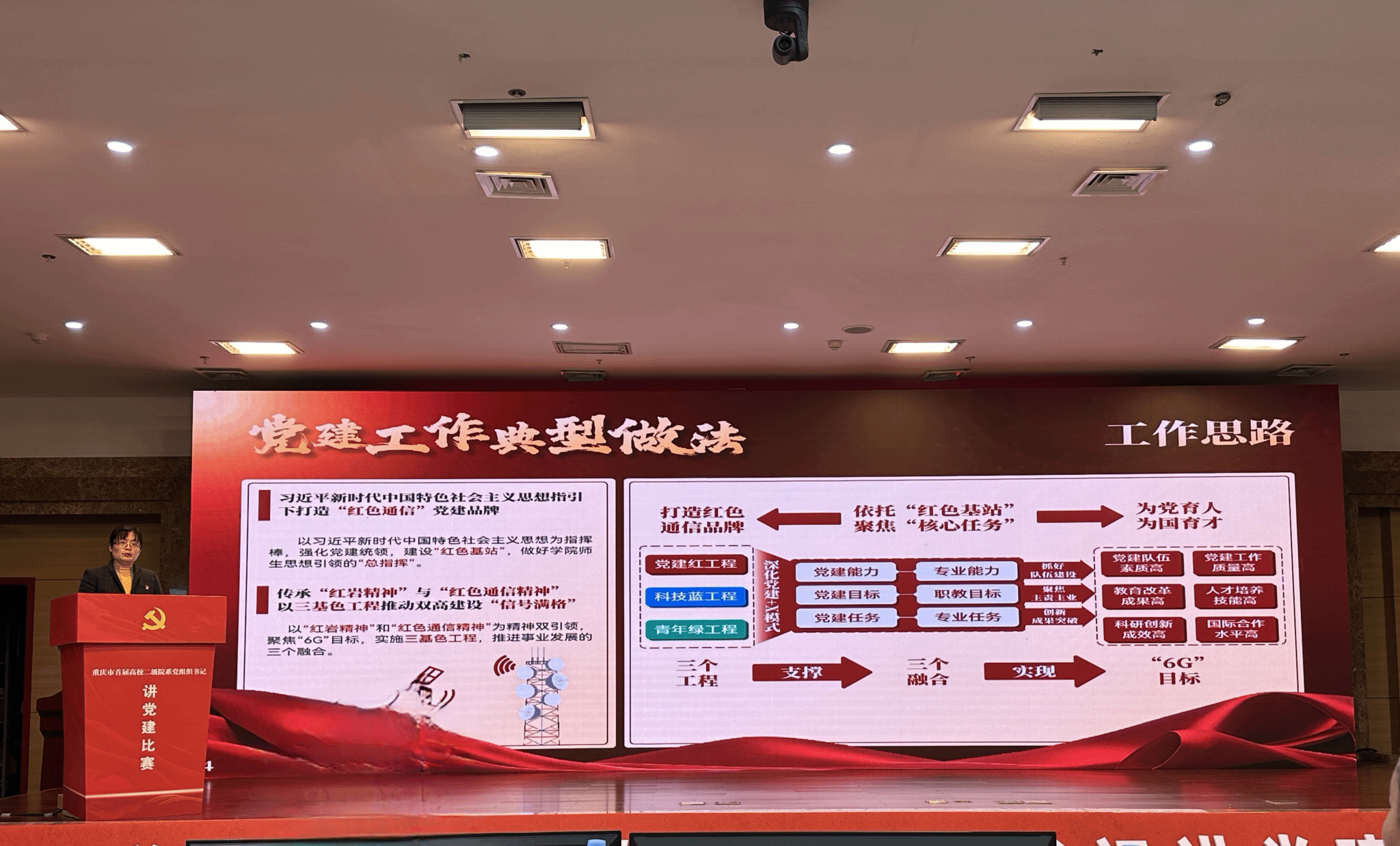 现场展示中,曾晓宏同志以打造“红色通信”党建品牌、推动双高建设“信号满格”为主题。紧紧围绕深入学习贯彻习近平总书记关于党的建设的重要思想这一主线,聚焦为党育人、为国育才的核心任务,结合学院党总支“红色通信”特色党建品牌,通过实施“三基色”工程,推进党建能力与专业能力、党建目标与职教目标、党建任务与专业任务三个融合,从而实现党建队伍素质高、党建阵地质量高、教育改革成果高、人才培养技能高、科研创新成效高、国际合作水平高的“6G目标”的党建工作新格局。曾晓宏同志以国家“双高计划”建设学院抓牢党建的视角,充分展示了我校打造具有“重电”辨识度的“党建品牌”的实践历程,以及高质量党建统领事业高质量发展取得的成绩与经验。