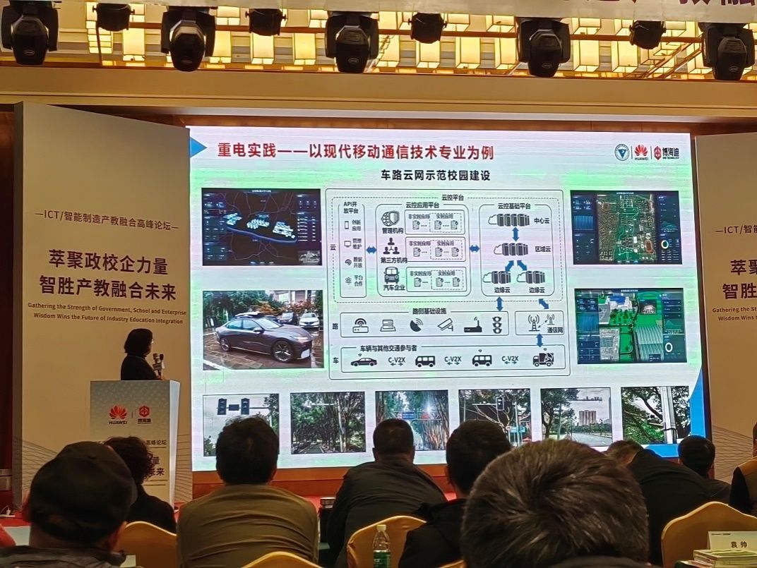 分享中,陶亚雄教授分享了智能网联跨学科复合型人才培养的重电探索与实践。一是回顾重电与华为的合作,在课程体系重构、实训基地建设、职教师资培养、高素质人才培养等方面成效突出。二是立足服务区域产业集群、经济社会发展,学校成立智能网联新能源汽车技术创新中心,搭建了西部首个车路云网一体化示范校园。三是重电在智能网联跨学科复合型人才培养和技术创新的探索与实践,着重分享了随课程模块调整的室内车路协同实训系统。