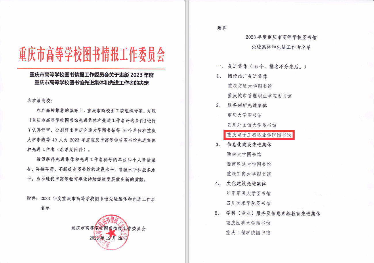 近日,重庆市高等学校图书情报工作委员会印发了《关于表彰2023年度重庆市高等学校图书馆先进集体和先进工作者的决定》,我校图书馆被评选为“2023年度重庆市高等学校图书馆服务创新先进集体”,连续三年获此殊荣。