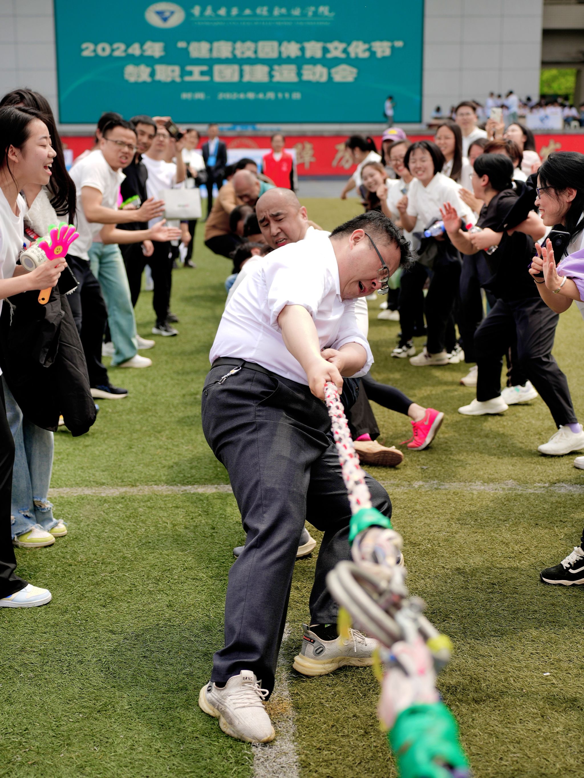 体操展示环节结束后,教职工们积极地参与了各个项目,在超级障碍赛、智慧汉诺塔、万众一心、多项拔河等四个项目中,欢呼声此起彼伏,教职工们活跃的比赛热情洋溢在操场上。