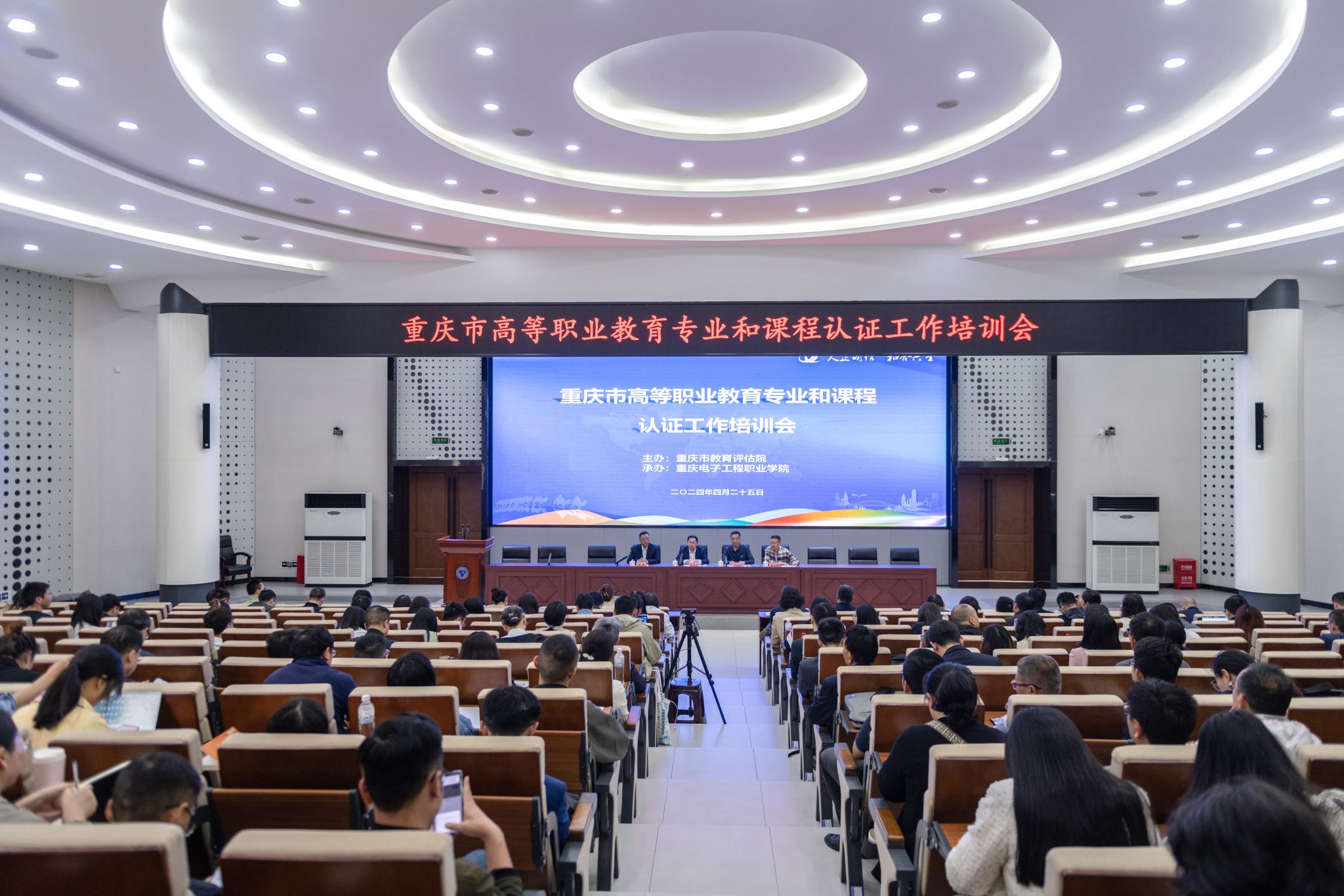 4月25日,由重庆市教育评估院主办,我校承办的“重庆市高等职业教育专业和课程认证工作培训会”在博远厅召开。重庆市教育评估院党总支书记、院长刘云生,我校副校长刘成俊出席会议,重庆市属高职学校、西部职业教育评估平台建设单位及西部相关高职学校500余人线上、线下参加了培训,其中我校有近50名教师参加了现场培训。培训会由重庆市教育评估院职成教评估所所长黄承国主持。