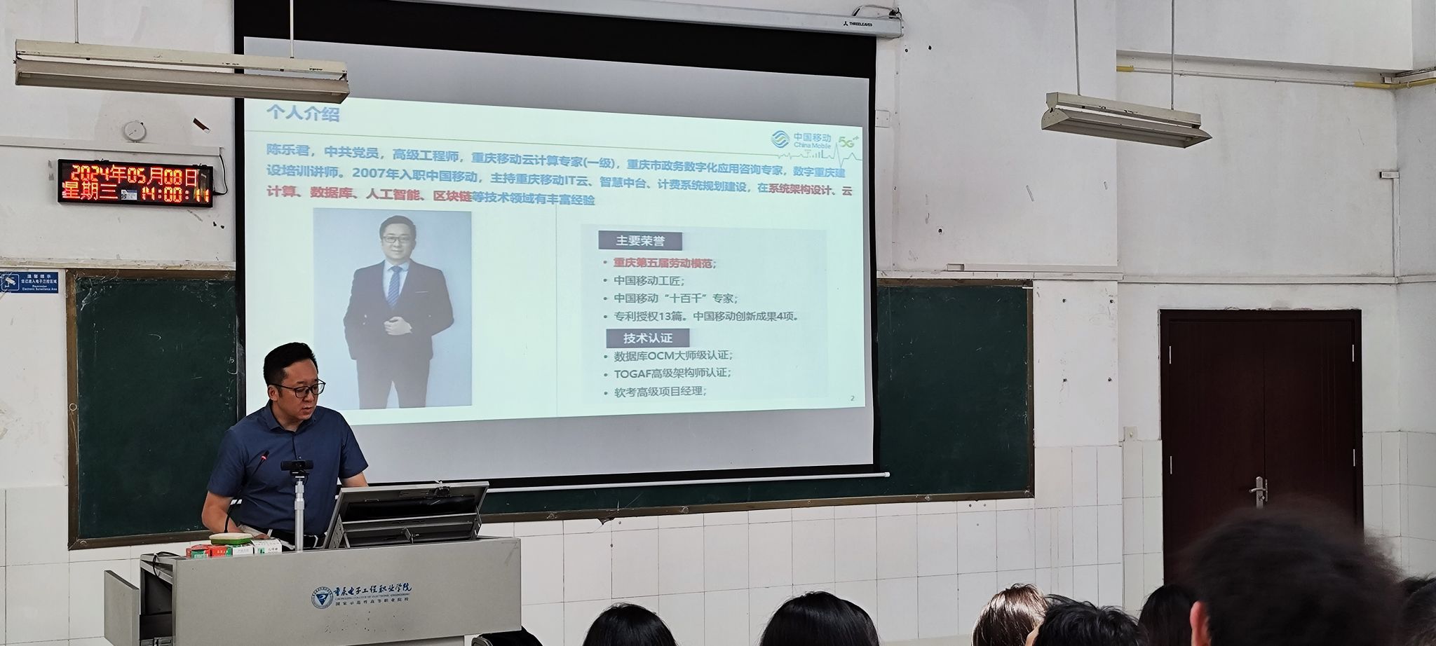 在为时90多分钟的报告中,陈导师介绍了中台技术体系的背景与实施、云计算/区块链/隐私计算等技术应用、数字重庆技术体系等产业应用,最后给学子们就今后的学习和工作提出了中肯专业的建议。参会学生认真聆听了专家讲座,了解了技术新发展和产业新应用,对自己所学知识和技术在生产实践中的应用有了更为清晰的认识,更加坚定了锤炼技能,成长为高素质技术技能人才的信心。