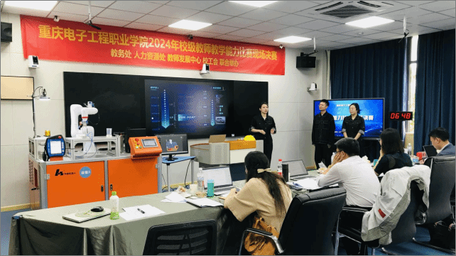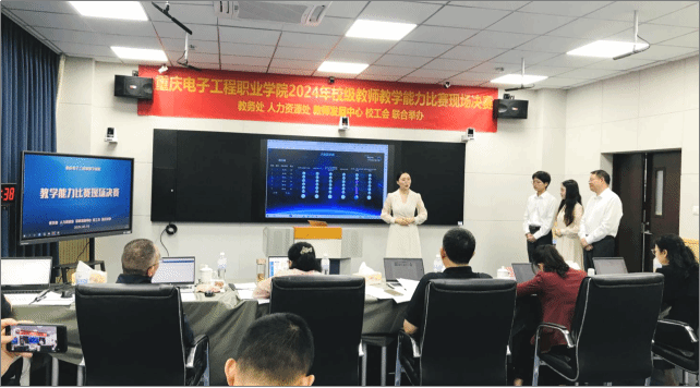 参加校级教学能力比赛的团队来自11个学院39支队伍,经过网评初赛,最终有23个教学团队进入到现场决赛。本次现场决赛分为两组,第1组(电子信息大类和公共基础课程)的11支队伍在14-301智慧教室进行比赛,第2组(智能医疗装备技术大类、装备制造大类、新闻传播大类、土木建筑大类、旅游大类、财经商贸大类、现代物流管理大类、医药卫生大类)的12支队伍在14-302智慧教室进行比赛。现场决赛由四个环节组成,专家网上查看参赛材料6分钟、教师说实施报告8分钟、无生教学展示8分钟和答辩10分钟。
