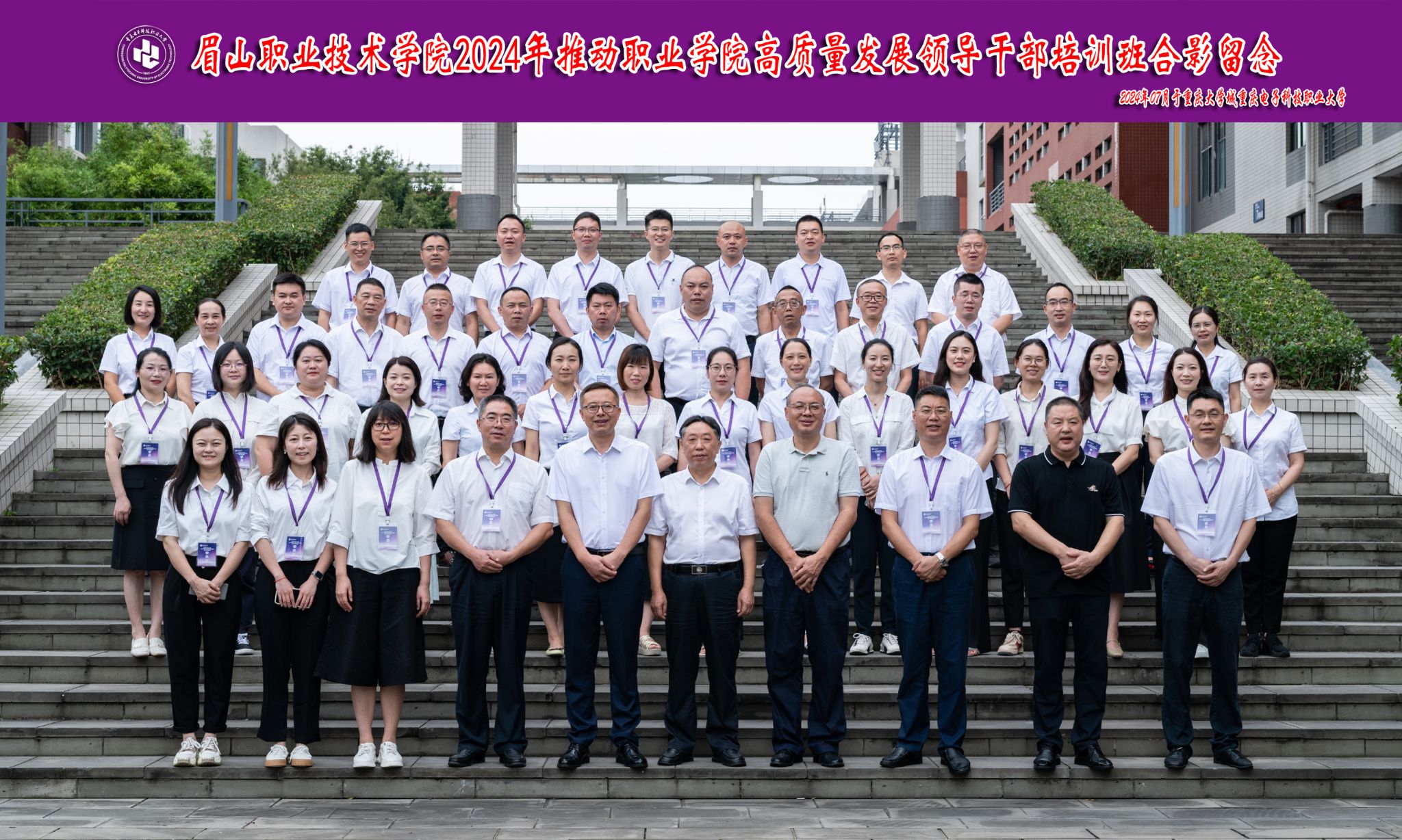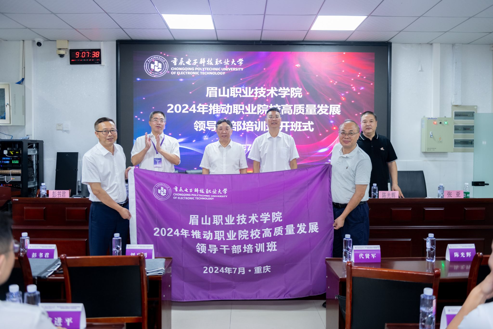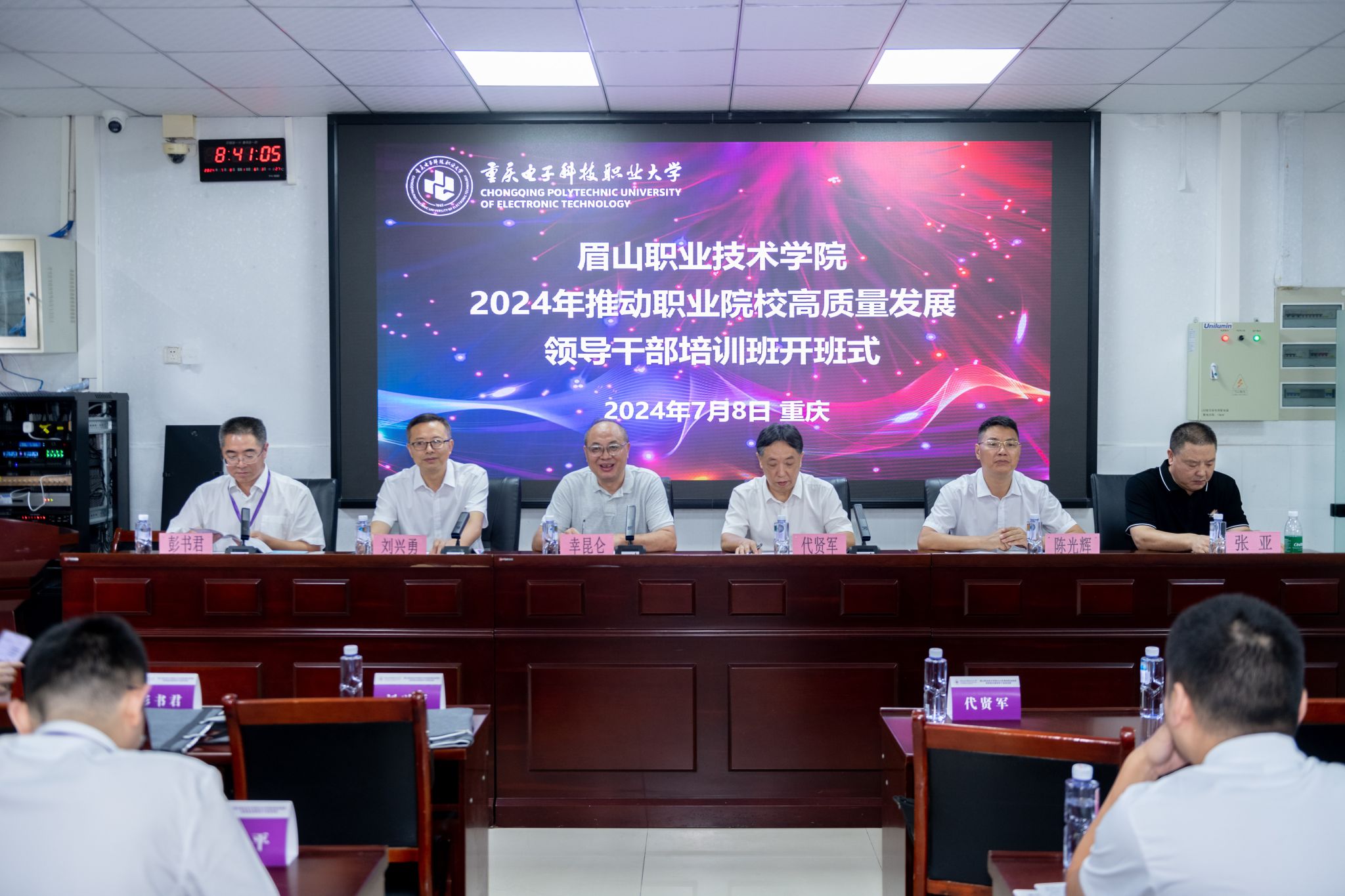 7月8日,眉山职业技术学院2024年推动职业院校高质量发展领导干部培训在我校职教师资培训基地博才厅举行开班仪式。参加开班仪式的有重庆电子科技职业大学党委常委、副校长幸昆仑,国培基地办公室副主任张亚;眉山职业技术学院党委书记代贤军,党委副书记、院长刘兴勇,党委委员、副院长陈光辉,党委委员、工会主席彭书君以及来自眉山职业技术学院的42名干部学员。开班仪式由彭书君主持。