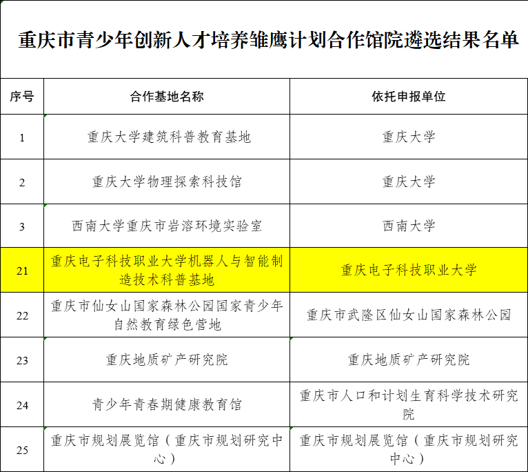 近日,重庆市教育科学研究院发布了关于重庆市青少年创新人才培养雏鹰计划合作馆院遴选结果的通报,以智慧健康学院为依托单位的我校市级科普基地,经申报、材料审核、专家评审入选、公示无异议,被确定为合作馆院,为职业院校唯一入选单位。