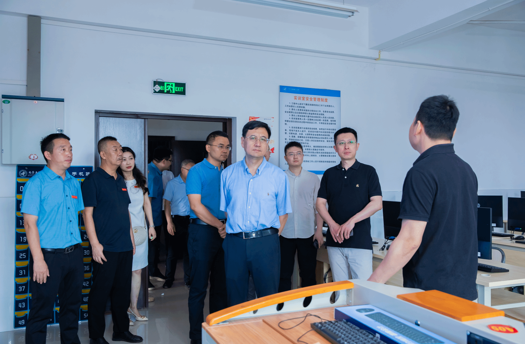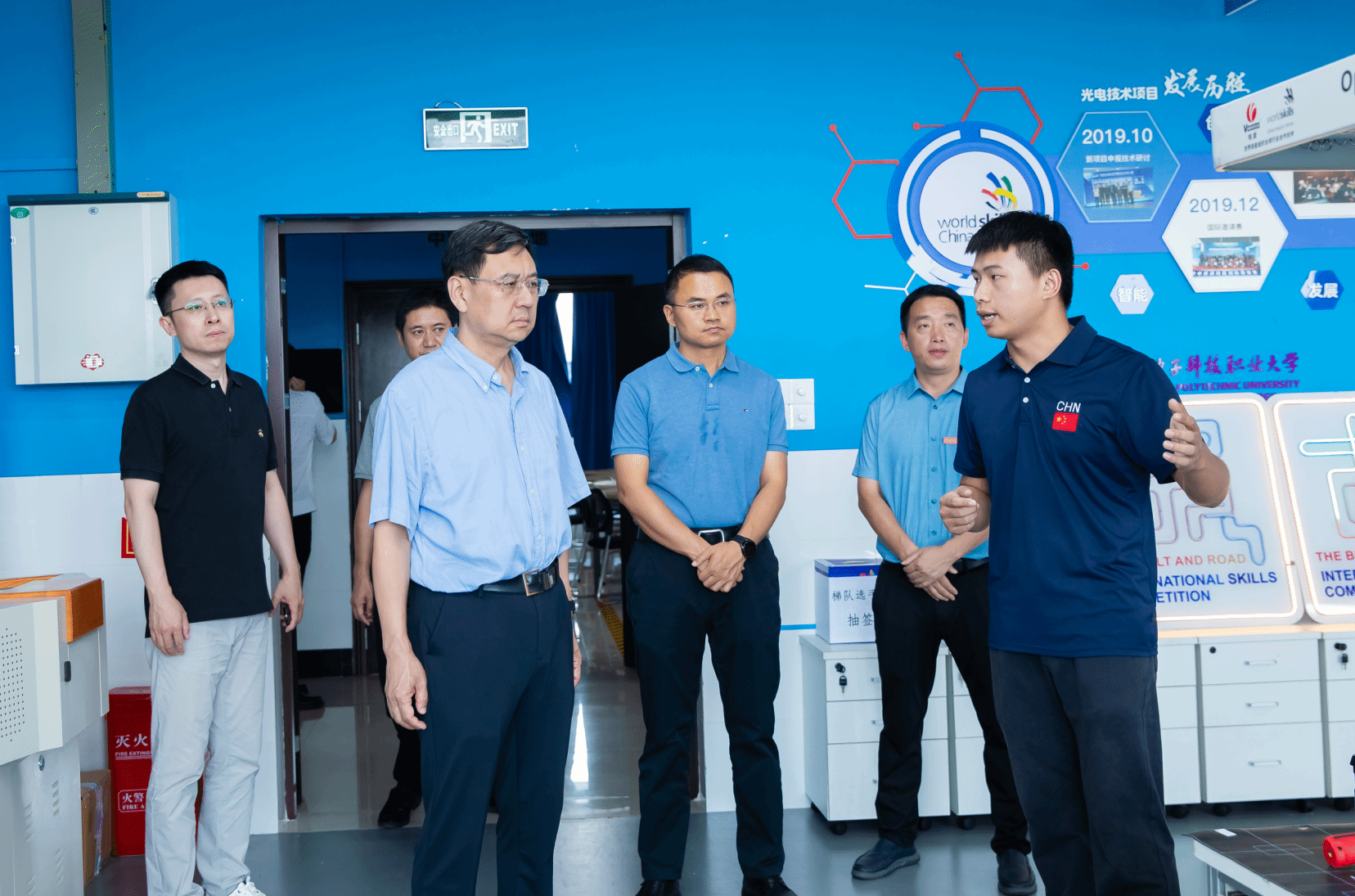 郭美荐一行参观了校史馆,深入了解了重庆电子科技职业大学的发展历程和未来规划。实地考察了电子与物联网学院的理论考试机房、世界技能大赛光电技术项目国家集训基地、智能制造与汽车学院的机床装调维修工和物联网安装调试员赛项的实操竞赛场地。