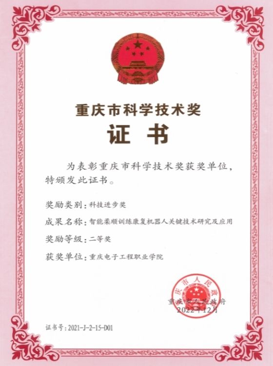 8月19日,重庆市科技创新大会召开,2023年度重庆市科学技术奖正式揭晓,本年度共有98项科技成果获得奖励。其中,以我校智慧健康学院谢光辉教授团队主持完成的成果《肢体关节功能康复训练系统研发及产业化应用》获得科技进步三等奖,是重庆市职业院校牵头的唯一获奖成果。该成果为我校近3年来连续主持获得的第5项重庆市科学技术奖,同时,也是该团队继主持获重庆市科技进步二等奖(2022年)、重庆市首届优秀专利奖(2023年)后的第三项科技创新标志性成果。