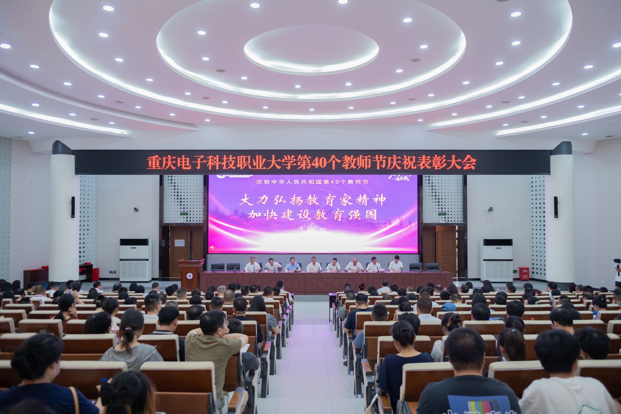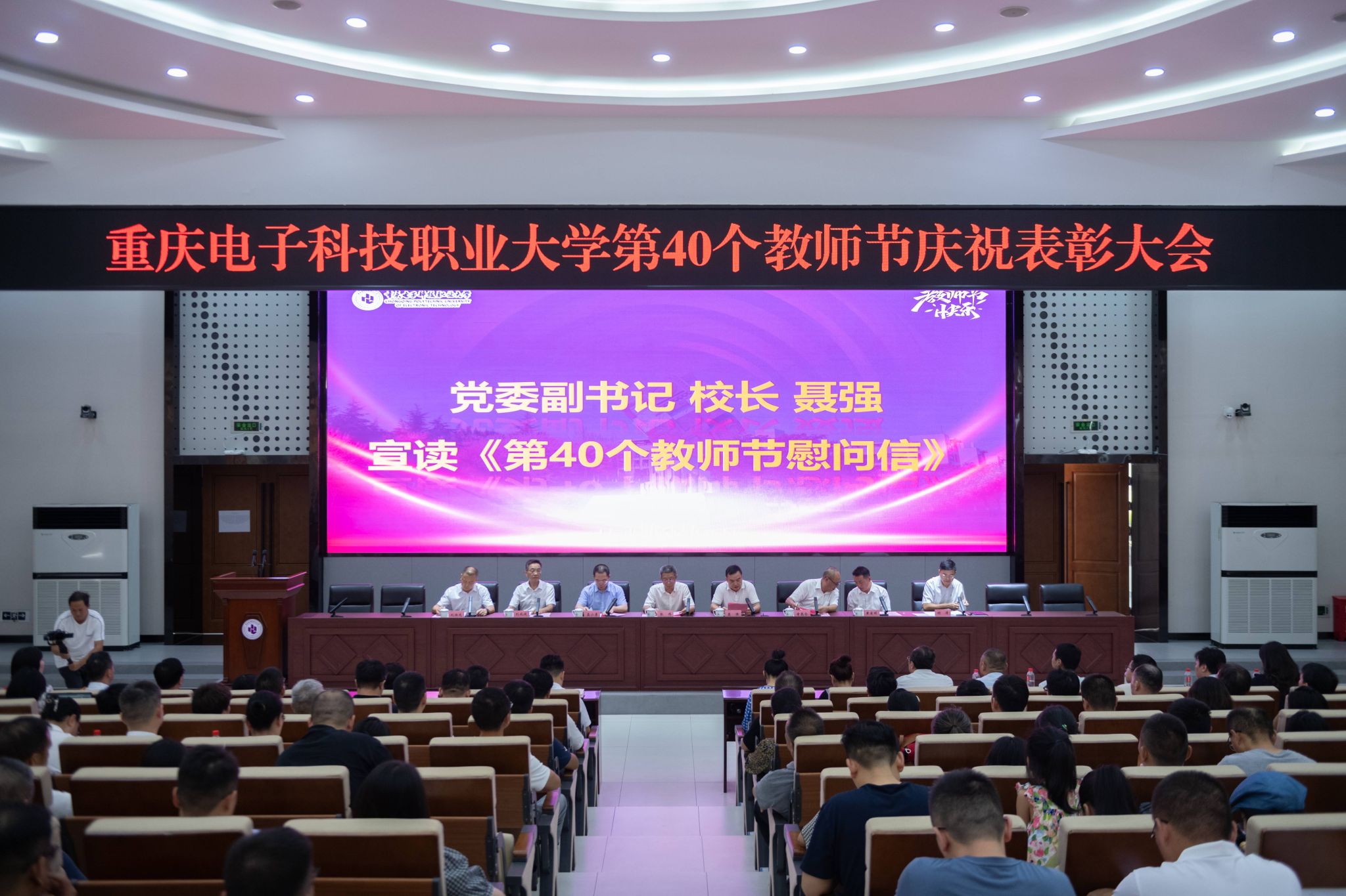 桃红流丹,秋菊逸彩。9月10日下午,重庆电子科技职业大学第40个教师节庆祝表彰大会在博远厅召开。会议由党委常委、副校长幸昆仑主持,党委书记张伟出席并讲话,校领导、党委教师工作委员会成员单位负责人及师生代表近300人参会。