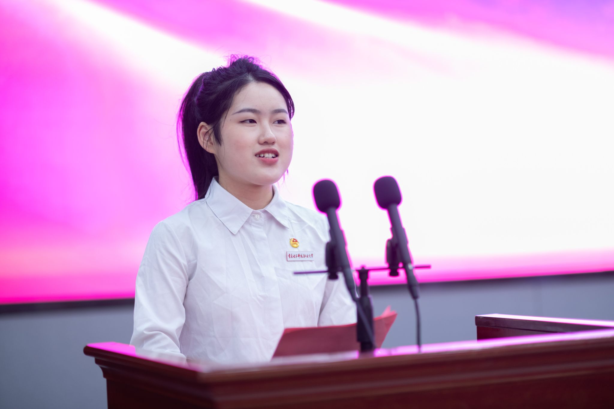 会上,来自智慧健康学院旅游管理2204班的袁宇鸿同学,分享了自己的学习、成长经历,讲述了“在一位位老师的引导下,追逐光、靠近光、成为光”的重电故事。