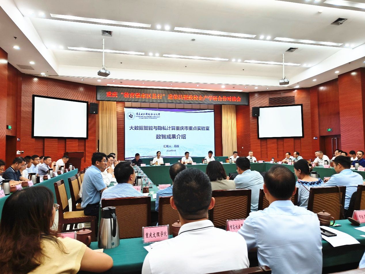 2024年9月26日,重庆“教育强市区县行”进荣昌暨政校企产学研合作对接会在荣昌区行政中心举行。此次对接会旨在深化政校企合作,推动产学研深度融合,促进区域经济社会发展。学校党委书记张伟教授应邀出席会议,学校科研与社会服务处、大数据智能与隐私计算重庆市重点实验室相关负责人参加会议。