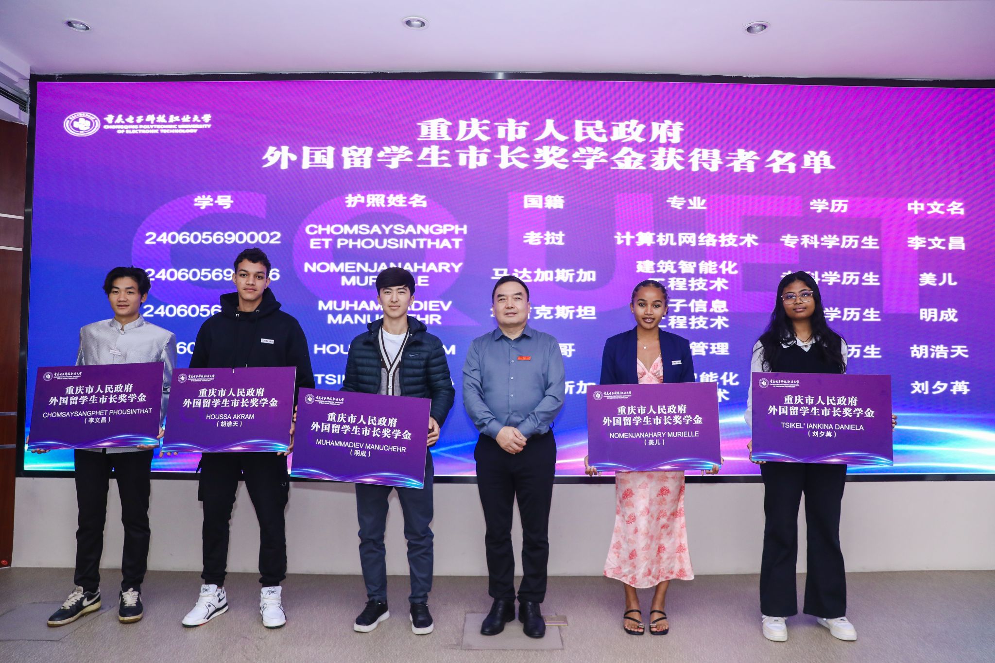 (聂强校长为留学生代表颁发重庆市人民政府外国留学生市长奖学金)