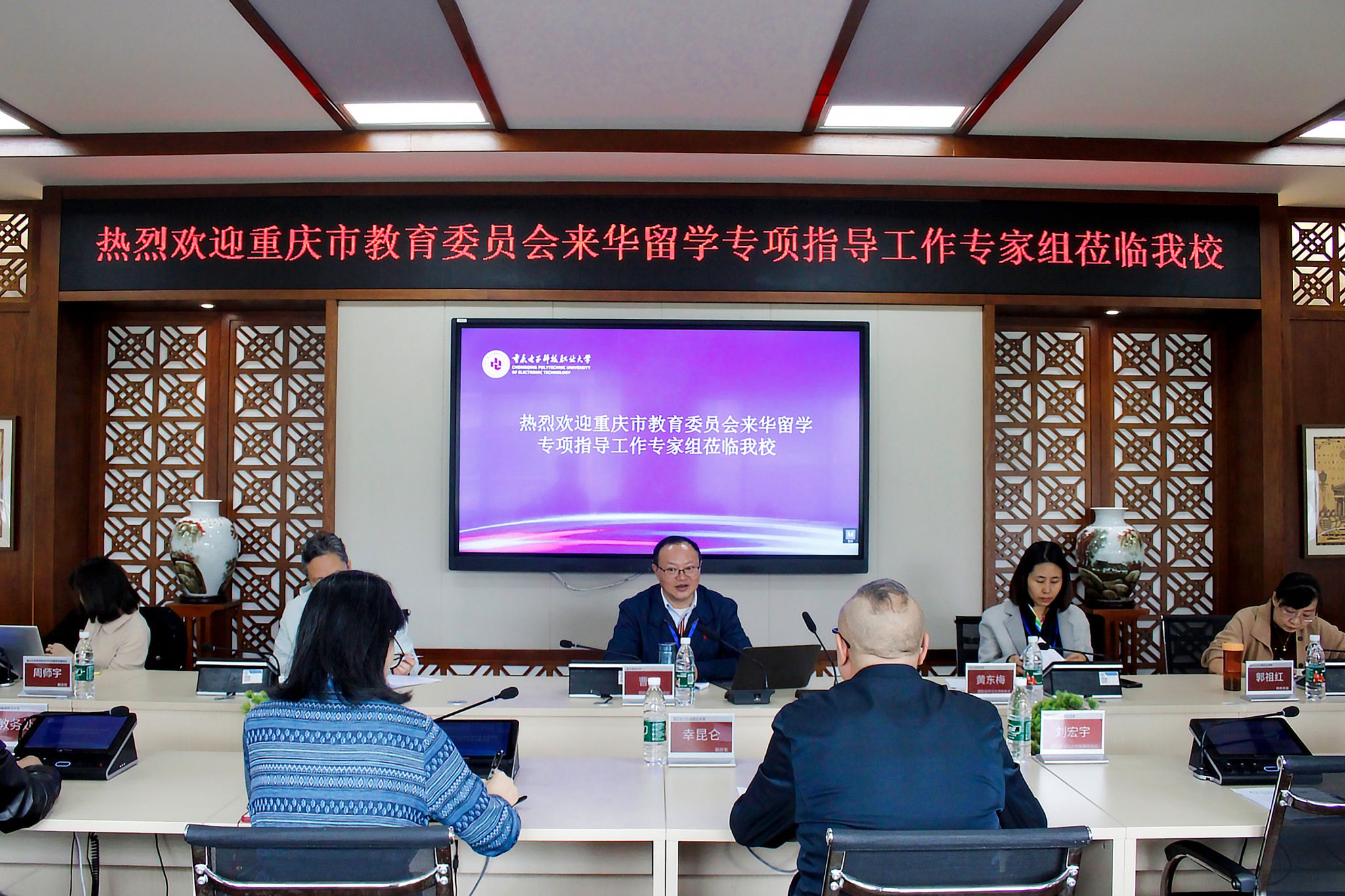 11月5日上午,重庆市教育委员会来华留学生专项指导工作专家组:重庆邮电大学国际学院党总支书记曹华,重庆师范大学国际处前处长、国际学院前院长雷勇,长江师范学院国际合作与交流处处长黄东梅,原重庆公共运输职业学院财务总监郭祖红,重庆市评估院教育部教育评价改革研究基地办副主任周师宇,重庆邮电大学国际学院干部何雨桑一行莅临我校指导相关工作。副校长幸昆仑,通识教育与国际学院院长沈雕,国际交流与合作发展处处长刘宏宇、副处长刘影以及相关负责人参加会议。