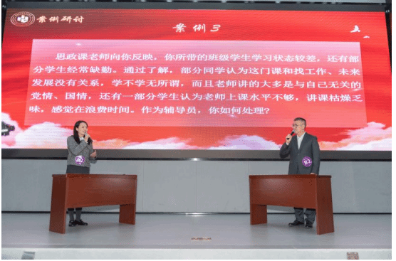 本次辅导员素质能力大赛现场赛分成案例研讨和谈心谈话两个环节,案例研讨重点考察辅导员的政治理论素养和工作业务知识以及综合运用理论分析问题、研判问题、解决问题的能力。比赛以“我提问,你回答”的方式开展,由AB选手围绕案例共同辨析原因、研讨对策、总结规律。