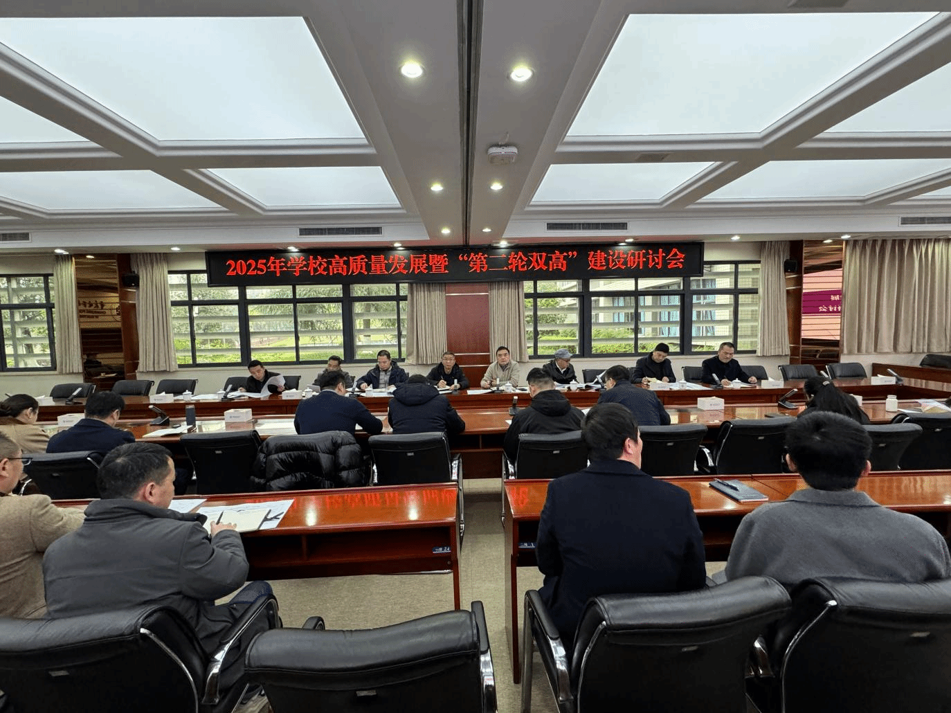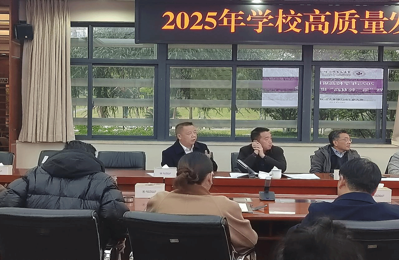 会议分三个阶段进行。第一阶段为实体性二级学院作专业群建设汇报。各实体性二级学院围绕“第二轮双高”建设专业群的组群逻辑、2025年工作重点任务、指标以及绩效产出等内容进行了详细汇报。