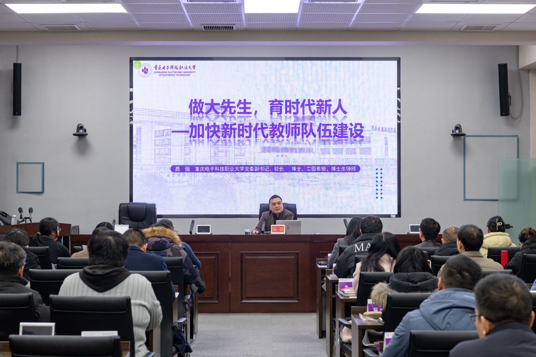在上午的校长第一课中,校长聂强以“做大先生,育时代新人”为主题,与教师们分享了学校作为国家首批、重庆首所公办本科层次职业大学的发展历程。他指出,新时代对教师提出了新要求,培养人才需实现教学与生产的有机融合。课堂上,他讲明了高职教师专业发展的新定位,深入浅出地解读了职业师资教育相关政策,从教学、科研、社会服务三方面为青年双师型职业教师的发展指明了路径,使教师们对行业发展有了更清晰的认识。同时,聂强校长勉励教师们成为研究者、学习者、合作者,努力成为“三师合一”的优秀教师,寄语大家志存高远,争做新时代的大先生。