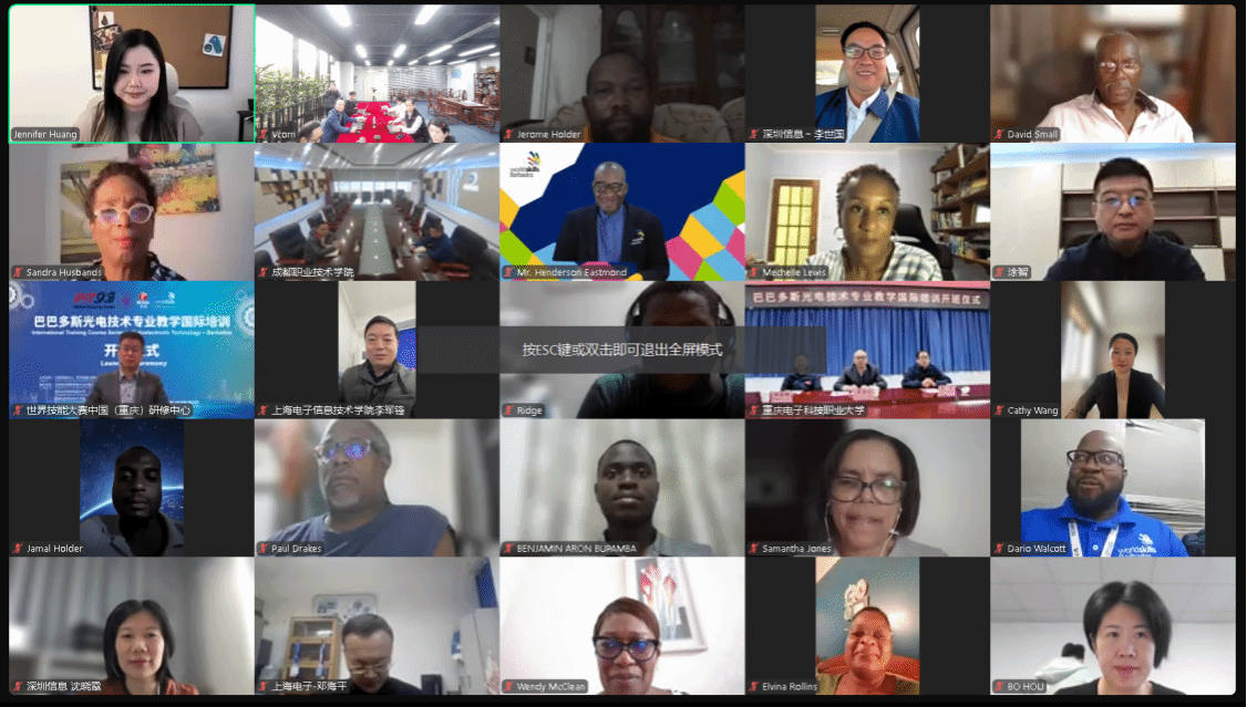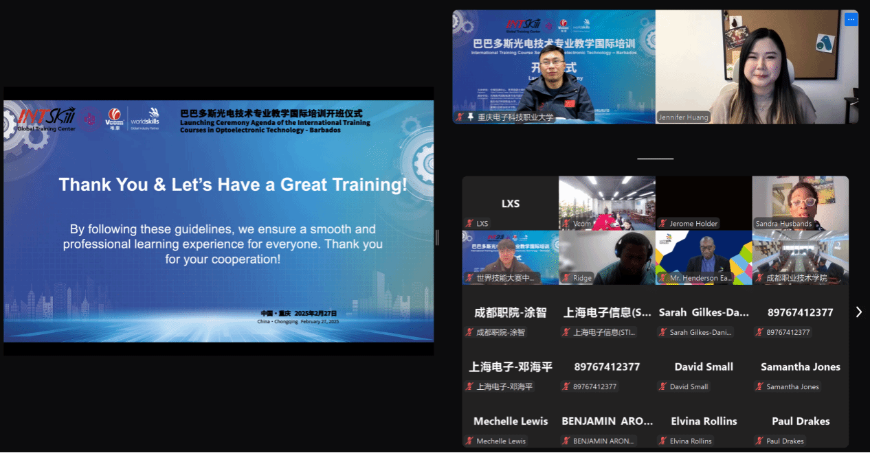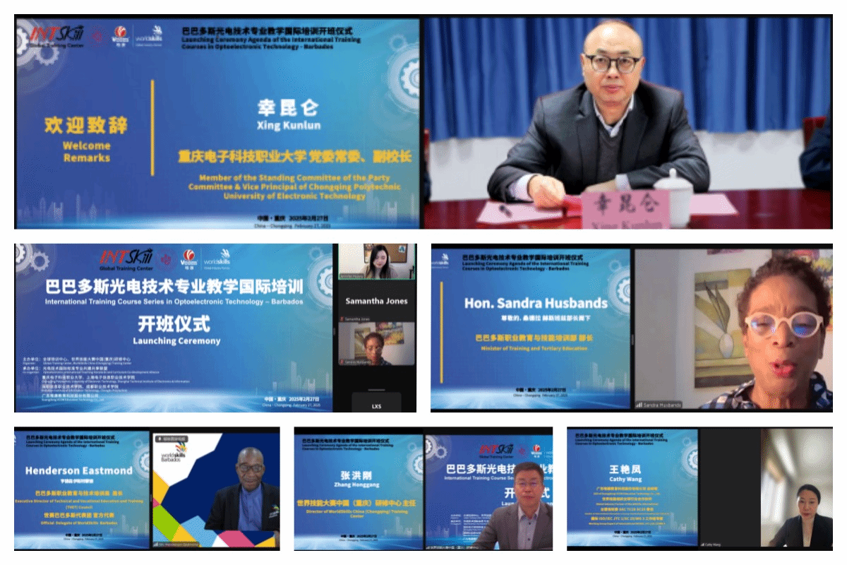 近日,由全球培训中心、世界技能大赛中国(重庆)研修中心、重庆电子科技职业大学、广东唯康教育科技股份有限公司等单位与巴巴多斯职业教育与技术培训局联合发起的“巴巴多斯光电技术专业教学国际培训开班仪式”在云端隆重举行。此次培训项目是巴巴多斯首次针对光电技术领域开展的系统性国际培训,旨在通过理论与实践相结合,培养具备全球竞争力的高技能人才。巴巴多斯职业教育与技能培训部部长桑德拉·赫斯班兹(Sandra Husbands)、巴巴多斯技术和职业教育与培训指导局局长亨德森·伊斯特蒙德(Henderson Eastmond)、世界技能大赛中国(重庆)研修中心主任张洪刚、广州维康教育王艳凤以及多名职业院校领导,我校副校长幸昆仑、电子与物联网学院院长陈良、周渝曦教授等出席了线上仪式。