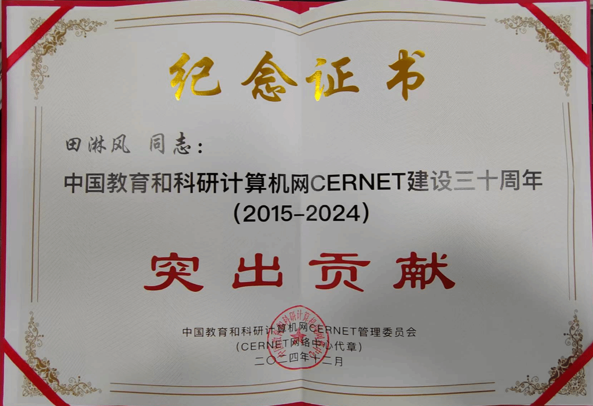 中国教育和科研计算机网建设30周年纪念大会在北京举行。会议期间评选了中国教育和科研计算机网CERNET建设30周年突出贡献集体和先进个人,我校教师田淋风获评CERNET建设30周年突出贡献个人。