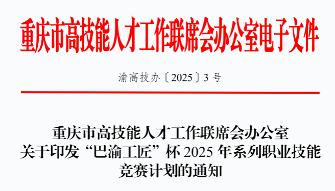 重庆市高技能人才工作联席会办公室发布《关于印发“巴渝工匠”杯2025年系列职业技能竞赛计划的通知》,为深入贯彻习近平总书记关于技能人才工作的重要指示批示精神,认真落实中办国办《关于加强新时代高技能人才队伍建设的意见》要求,紧紧聚焦“33618”现代制造业集群,加快推进“巴渝工匠2025”行动计划和“智能+技能”数字技能人才培养试验区建设,根据《重庆市职业技能竞赛管理和奖励补助办法》(渝高技办【2021】14号)有关规定,着眼数字重庆建设和高技能领军人才培育需要,经申报审核、评估遴选、统筹整合,重庆市今年计划开展30项市级行业竞赛、18项区县级竞赛、10项企业和院校技能练兵比武。