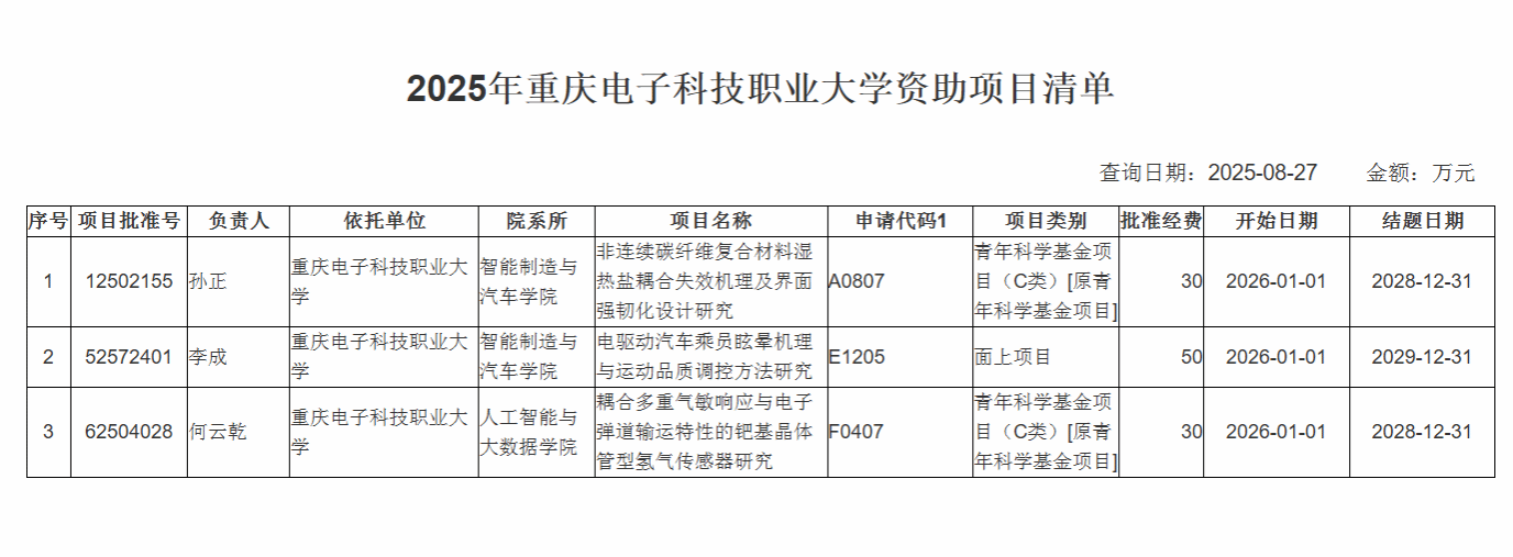 8月27日,国家自然科学基金委公布了2025年国家自然科学基金项目评审结果。我校成功获批立项3项国家自然科学基金项目,其中:面上项目1项,青年科学基金项目2项,共获批准经费110万元,实现历史性突破,立项数和批准经费均位列重庆市职业院校首位。
