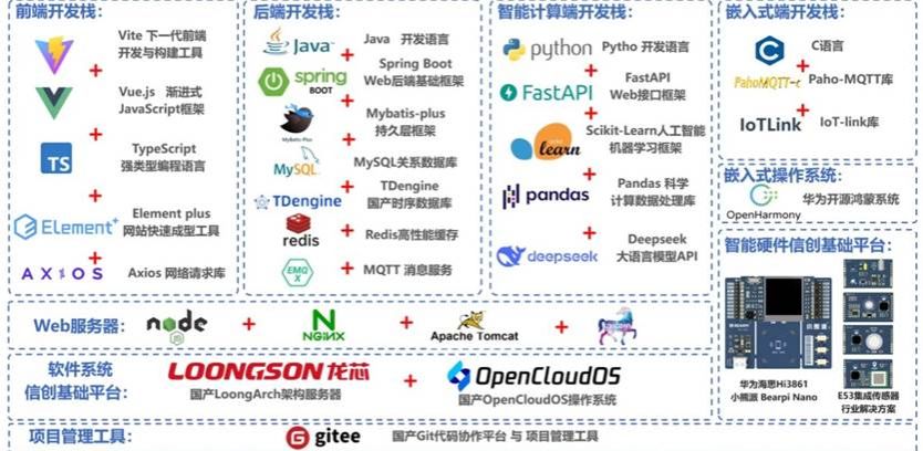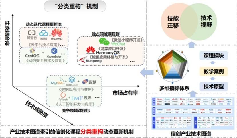 我校通信工程学院近年来响应国家信创战略号召,积极探索匹配产业需求的高素质技术信创技能人才培养模式。在通信软件工程等职业教育本专科专业中深入实践,通过深度产教融合,围绕课程体系、产教共育平台和特色思政育人等多维度,基于信创产业链全景图和头部企业技术路线图,构建覆盖“基础组件-核心平台-应用生态”的三级产业技术图谱,形成“技术成熟度-市场占有率-人才缺口度”三维指标体系,依托产教融合实训云平台,动态采集ICT 产业链技术迭代数据,通过构建“需求识别-分类重构-动态迭代”三阶联动机制,建立“技术需求-课程模块”智能匹配模型,实现课程内容与信创技术演进的同频共振,形成了产业技术图谱牵引的信创化课程动态更新机制和人才培养体系。