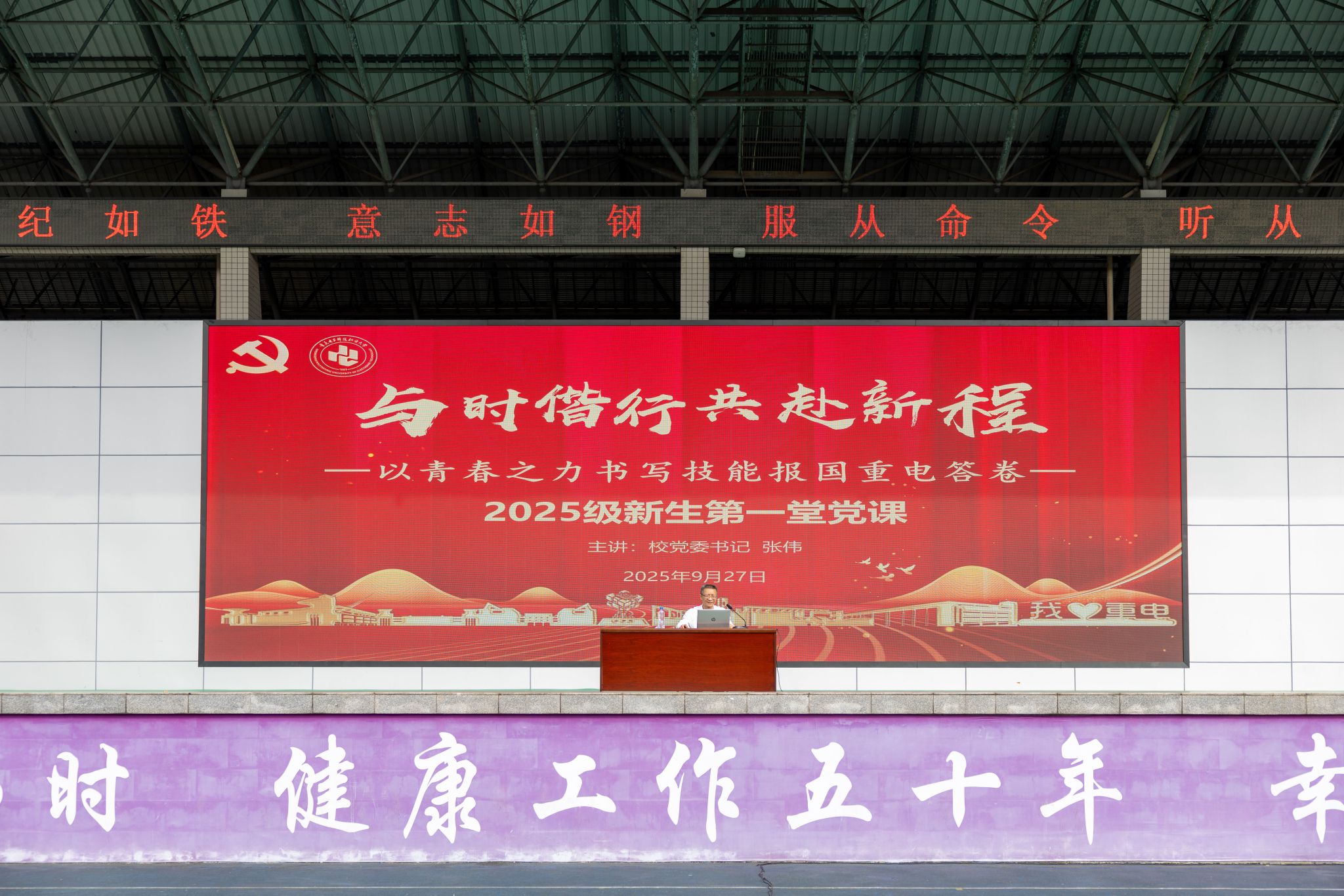 张伟书记对2025级新生的到来表示热烈欢迎,祝贺大家成为“重电人”。他提到,今年秋天很特别,我们共同纪念中国人民抗日战争暨世界反法西斯战争胜利80周年,也是学校建校60周年,与此同时,同学们也迈入了人生的全新起点。国之盛事、校之庆典、人之新程恰好在这个金秋相遇,这样的时刻,值得大家用心铭记、用力书写。