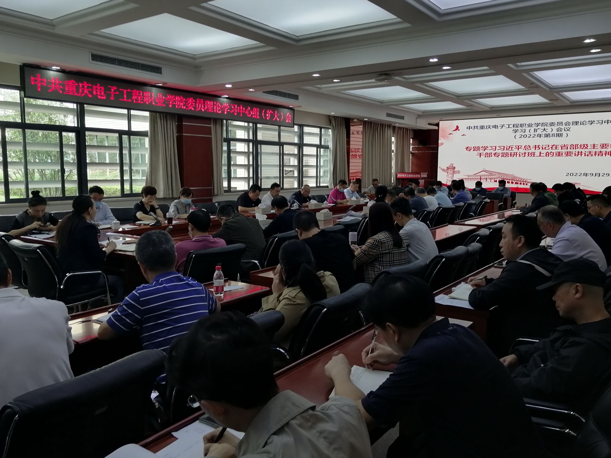 2022年9月29日上午,我校党委理论学习中心组(扩大)举行2022年第8次集体学习,专题学习研讨习近平总书记在省部级主要领导干部专题研讨班上的重要讲话精神。校党委理论学习中心组成员、处级领导干部参加会议。会议由党委书记孙卫平主持。