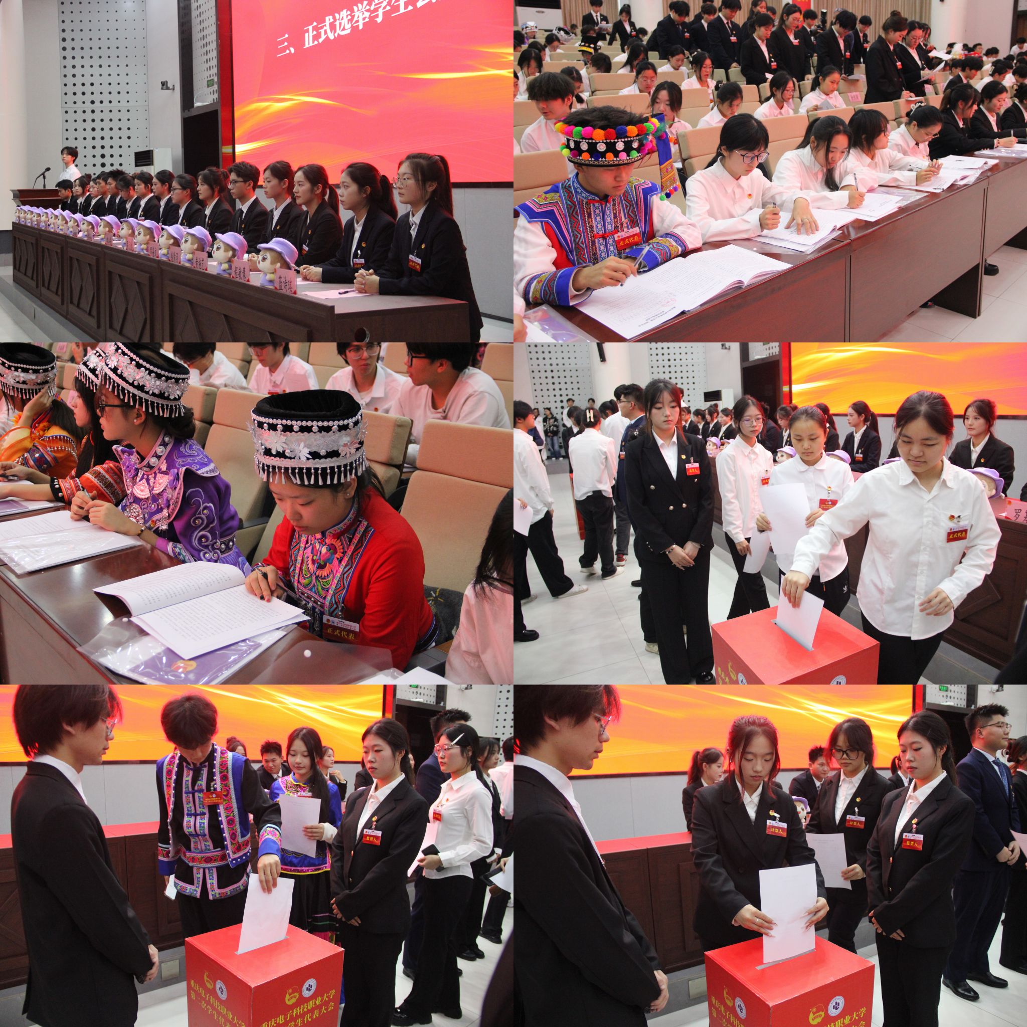 2025年11月7—8日,重庆电子科技职业大学第二次学生代表大会在博远厅召开。党委常委、副校长黄爱明,党委常委、党委宣传部部长徐继燕,党委学生工作部部长江兵,党委委员、工会负责人、关工委秘书长王永中,校团委书记钟佐彬,重庆市学生联合会驻会执行主席杨启东,学校各二级学院党总支书记、副书记、团总支书记,重庆师范大学、重庆工业职业技术大学、重庆航天职业技术学院、重庆城市管理职业学院、重庆建筑科技职业学院、重庆五一职业技术学院等6所兄弟高校学生会代表出席会议,学校236名学生代表参加会议。