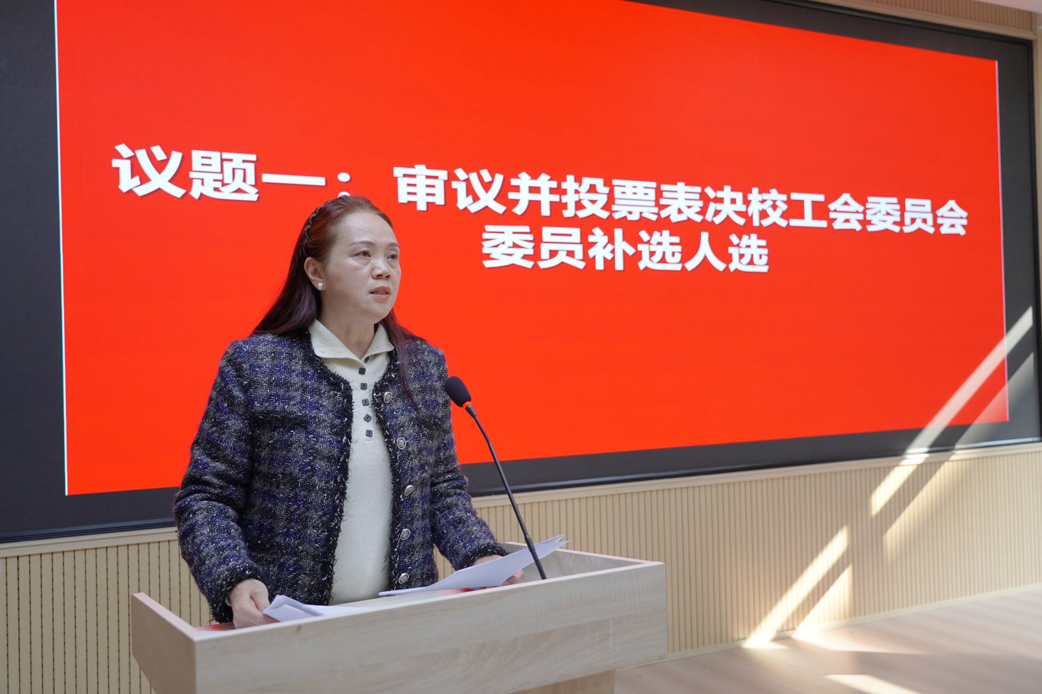 11月27日下午,我校2025年工会会员代表大会暨教职工代表大会在智联楼A座A106会议室顺利召开。学校党委常委、副校长幸昆仑,党委常委、副校长黄爱明,各职能部门和二级学院代表共计87名同志参加会议。本次会议有三个议题,由唐莉和王永中分阶段主持,聚焦工会委员会委员补选与制度审议,有序推进各项议程。