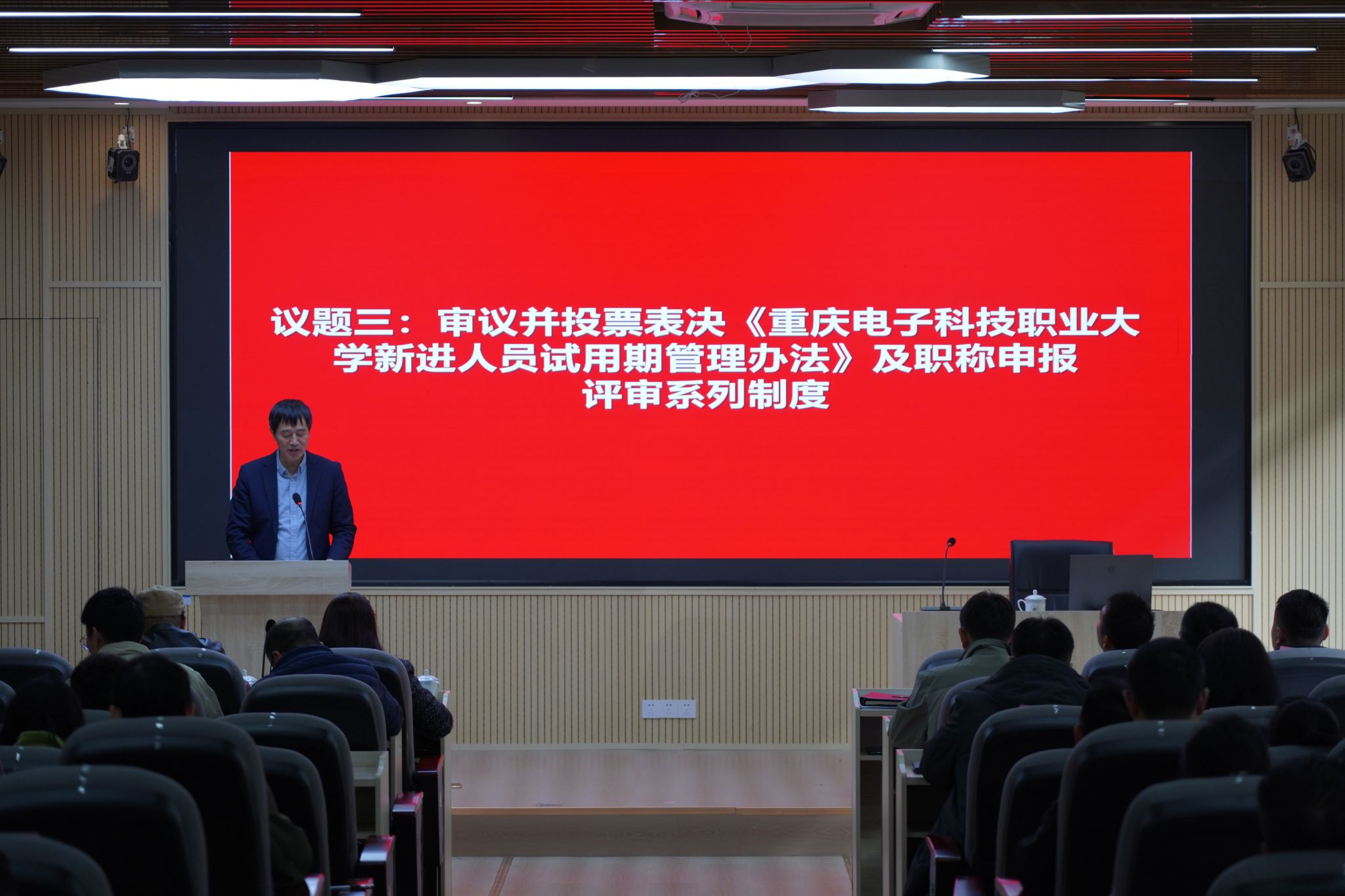 在后续议程中,大会审议并表决通过多项事关教职工切身利益与工会发展的重要制度文件,包括《重庆电子科技职业大学教职工代表大会实施办法》《重庆电子科技职业大学二级教职工大会实施细则》《重庆电子科技职业大学新进人员试用期管理办法》及“职称申报评审系列制度”。为帮助代表们精准把握制度内涵,党委教师工作部副部长贺彬恢对相关办法、制度的制定背景、核心内容及实施要点作了详细解读与说明。审议过程中,全体代表以高度的责任感和主人翁精神积极建言,严肃履行民主权利,充分彰显了民主决策、科学决策的鲜明导向。