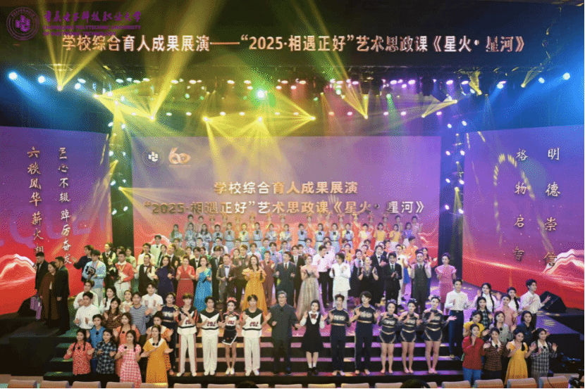 艺术思政 《星火·星河》在“学校综合育人成果展演”活动中, 一场名为“2025·相遇正好”的艺术思政课《星火·星河》精彩上演。该展演由学校倾力打造,以建校六十年发展历程为主线,通过情景朗诵、音乐舞台剧、歌舞等多种艺术形式,生动呈现了学校在不同历史时期与国家战略同频共振、服务产业发展的奋斗篇章,将思政教育融入艺术审美,成为一堂深刻而动人的“艺术思政大课”。