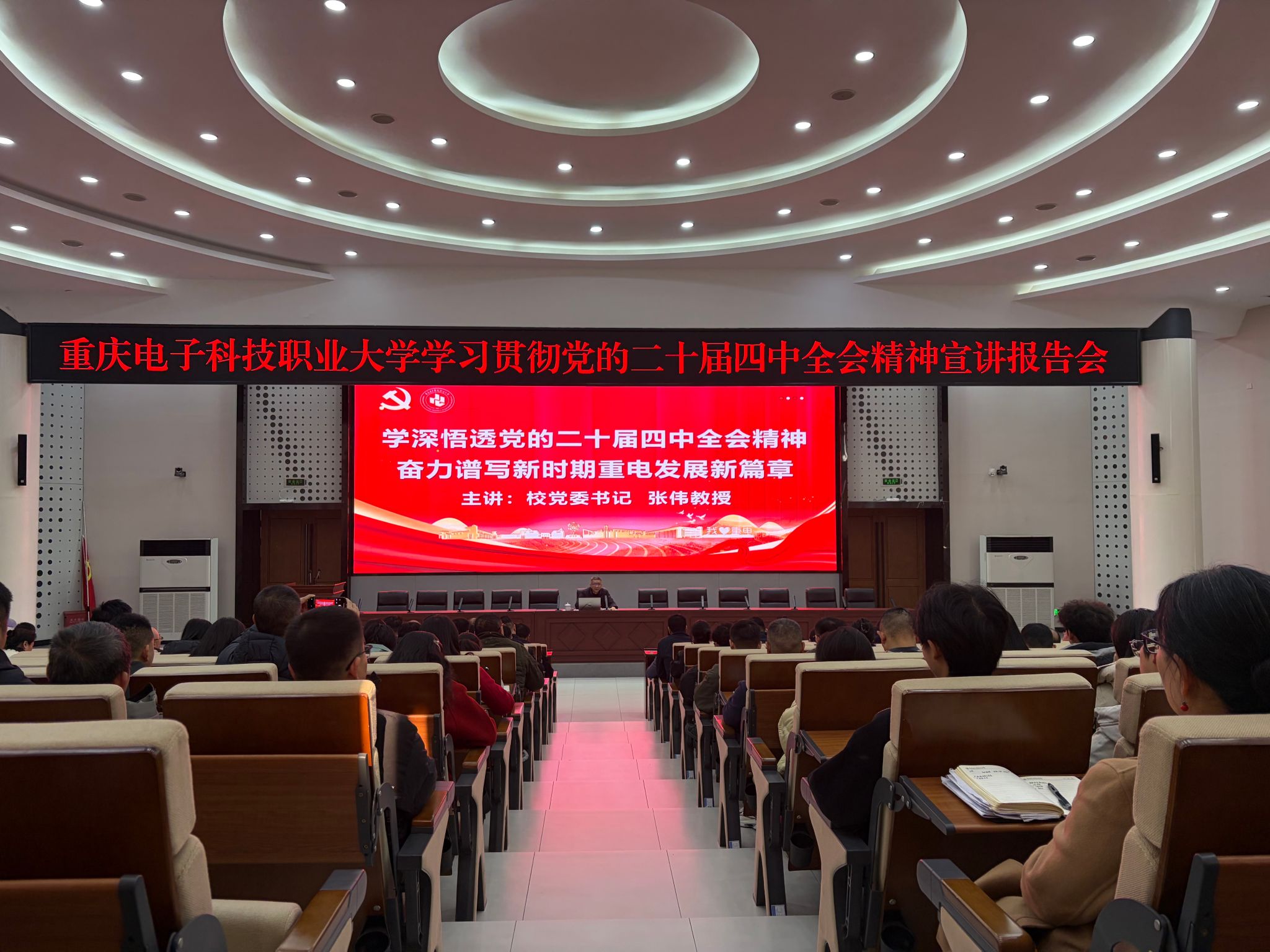 2025年12月10日下午,党委书记张伟以“学深悟透党的二十届四中全会精神 奋力谱写新时期重电发展新篇章”为题,在博远厅为全体在家校领导、全体处科级干部、全体辅导员、党政办公室、体育与国防教学部全体教师宣讲党的二十届四中全会精神,党委常委、副校长刘洪光主持。
