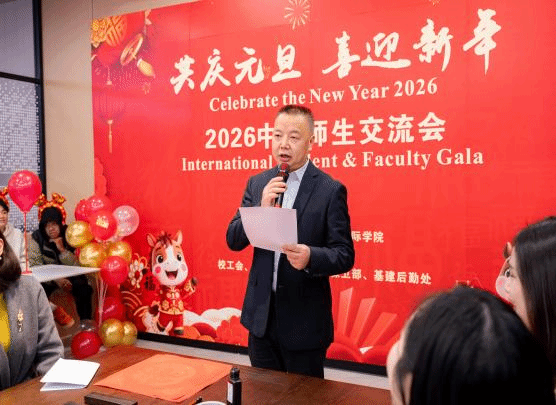 岁末迎新,暖意融融。2025年12月30日下午,国际合作与交流处、国际学院在南校区教工食堂共享厨房举办“共庆元旦·喜迎新年”中外师生交流会。校党委常委、副校长幸昆仑、刘洪光出席活动,与来自校工会、党委保卫部、基建后勤处、国际合作与交流处等部门的负责人、国际学院教师及全体留学生欢聚一堂,共迎佳节。此次活动由国际合作与交流处处长刘影主持。