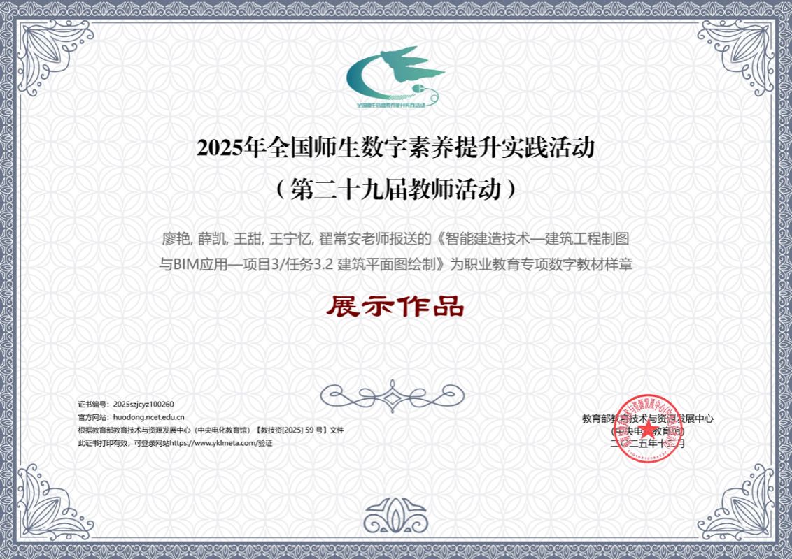 近日,教育部教育技术与资源发展中心(中央电化教育馆)公布了2025年全国师生数字素养提升实践活动(第二十九届教师活动)评选结果。我校廖艳、薛凯、王甜、王宁忆、翟常安等教师报送的数字教材样章《智能建造技术——建筑工程制图与BIM应用——项目3/任务3.2 建筑平面图绘制》,经省级推荐、全国评审,成功获评“职业教育专项数字教材样章展示作品”,彰显了我校在数字化教学资源建设与教师数字素养提升方面的突出成果。