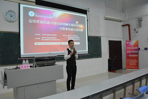 2018年4月26日,国家心理咨询师督导、世界技能大赛电子技术项目心理教练、重庆市人力社保局心理智库专家于志涛教授到我校作“系统化抗压能力训练促进师生可持续发展——以职业技能大赛为例”专题培训。来自重庆电子信息职业教育集团、重庆市物联网产业协会教育与培训专委会的代表,成都职业院校的代表,以及即将出征参加职业院校技能大赛的选手。共计100余人参加了此次培训。