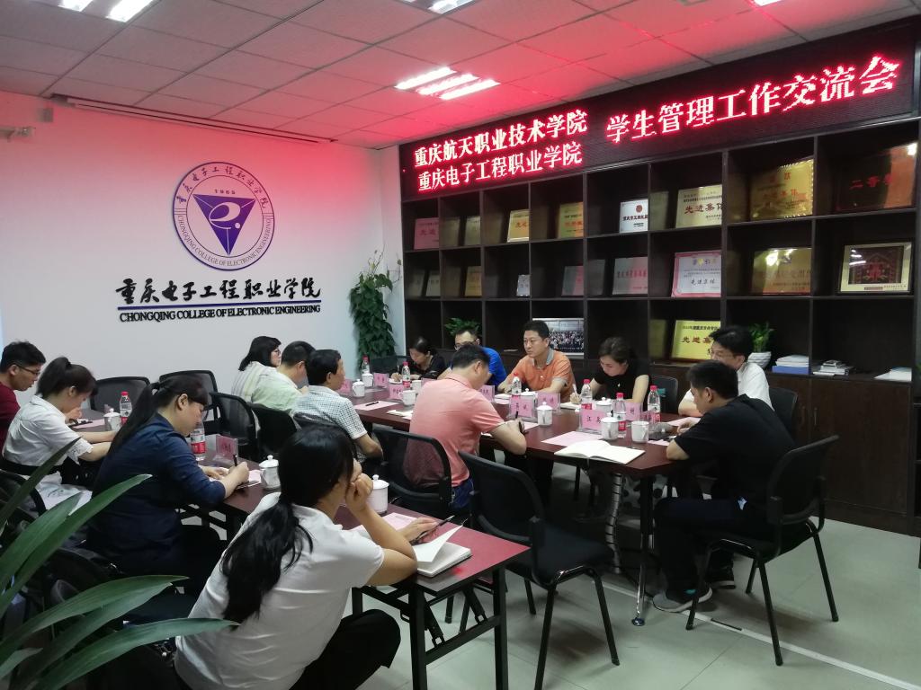 2018年5月18日下午,重庆航天职业技术学院学工部部长何杰民一行7人到我校交流学生管理工作。我校党委学生工作部部长何光明、副部长蒋斌、数字媒体学院党总支副书记钟佐彬等领导及相关工作人员参加了交流座谈。