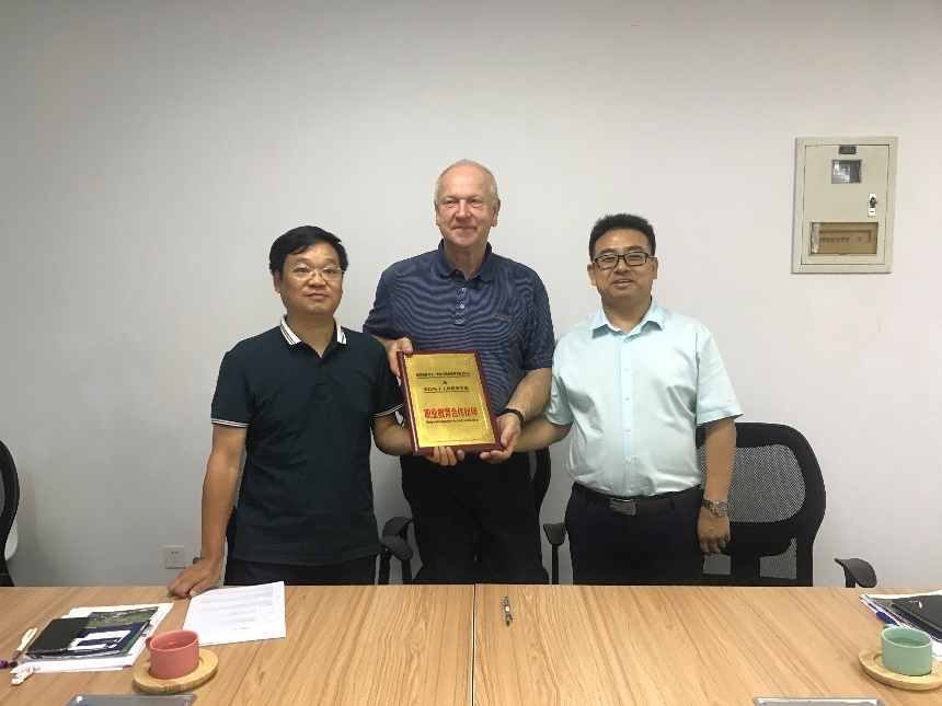 2018年5月24日,我校智能制造与汽车学院张进春院长带队赴北京与德国南图林根州手工业协会副会长Olaf Hollandt签署了智能制造技术与汽车技术师资联合培养协议,并授职业教育合作伙伴铜牌。