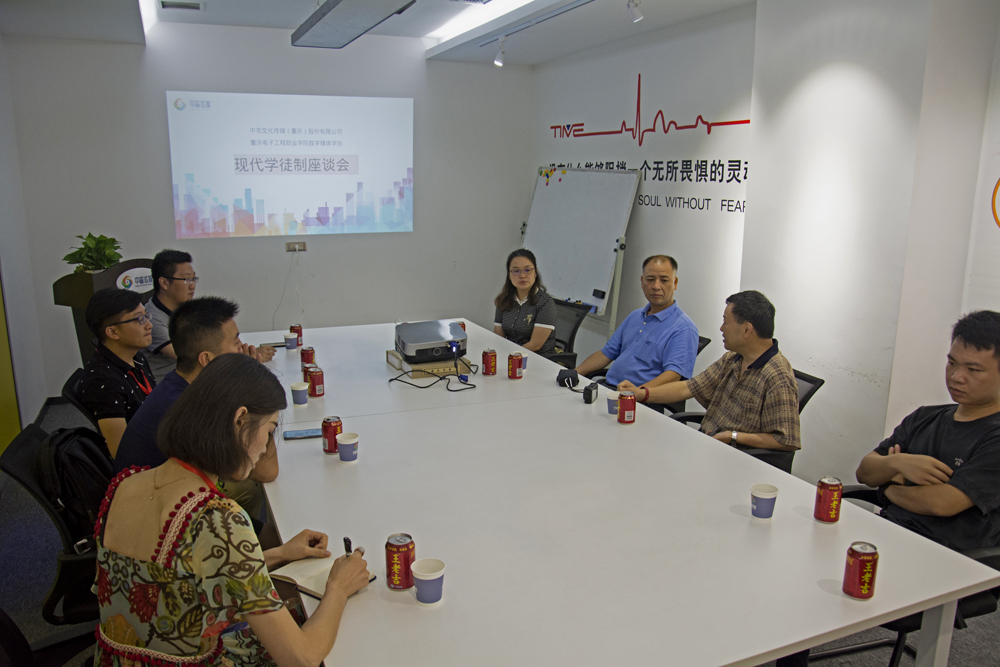 刘晓东和各合作企业负责人一同来到了中鸾文化传媒(重庆)股份有限公司,并在此召开了现代学徒制试点工作座谈会。他首先代表数字媒体学院向与会企业代表示了感谢,并就现代学徒制校方的执行情况进行了通报,合作企业代表就目前的学徒制在企业方的执行情况进行了总结汇报,并对下一阶段的试点工作建言献策。他结合校内外试点工作执行情况进行了总结,对下一阶段的工作进行了部署。与会代表对实习学生的优秀给予了高度赞扬,提出延长实习生在企业的实习实训时间等建议,他代表学校对此进行了回应,并提出了具体的解决方案。