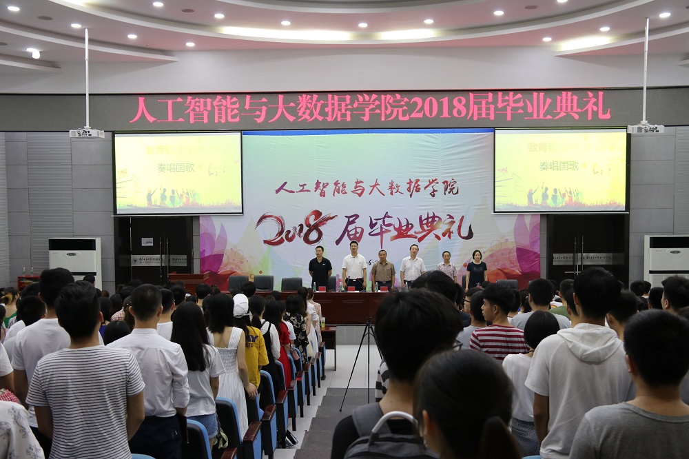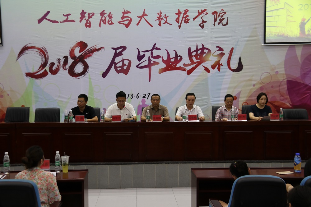 2018年6月29日下午2:30分,我校人工智能与大数据学院2018届毕业生典礼,于南区博远厅正式开始。出席本次毕业典礼的有人工智能与大数据学院党总支书记吴焱岷,人工智能与大数据学院院长武春岭,党总支副书记刘宏宇,组织员、行政督导员刘松,办公室主任甘沅鑫,学管科科长万鹏, 2018届全体辅导员老师。