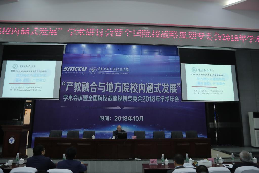 本次学术会议主要分为五个阶段:大会报告、主旨报告、高教管理专题论坛、院校发展与学科建设专题论坛、产教融合实践基地学习考察。大会报告阶段,中国人民大学周光礼教授以“以九个坚持为根本遵循扎根中国大地办大学”为题解读了习近平总书记的教育观;重庆市教育委员会高教处处长蒋后强教授首先代表重庆市教委副主任刘宴兵致辞,并以“地方院校内涵式发展的基本途径:产教融合”为题,阐释了产教融合的核心理念和教育行政部门的责任;北京大学施晓光教授以“新形势下地方本科高校发展问题:从理念到行动”为题阐述了本科高校发展的七大策略;我校刘成俊副校长以“重庆电子工程职业学院产教融合长效机制的探索之路”为题介绍了我校推进产教融合的具体举措。