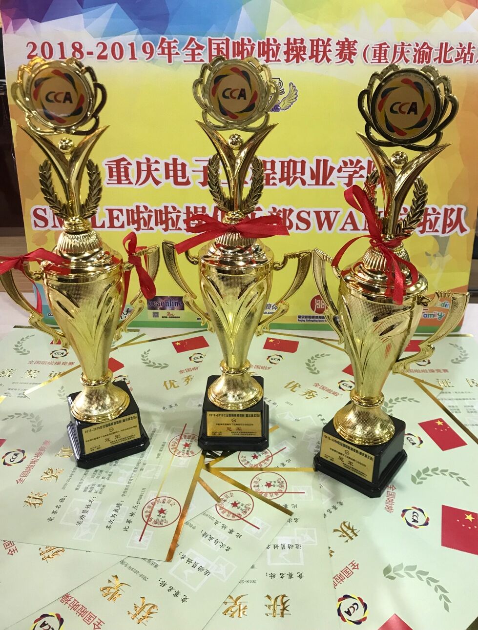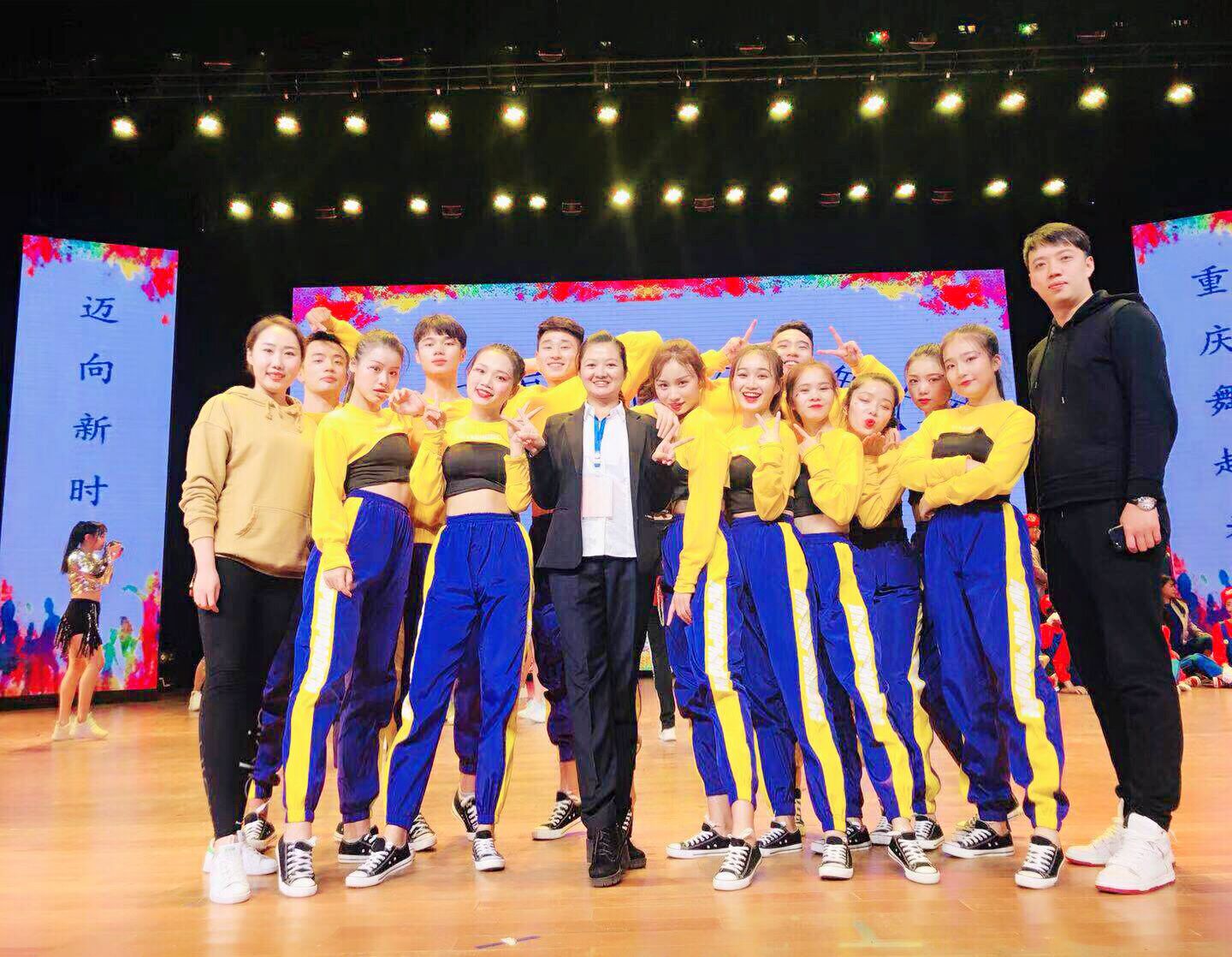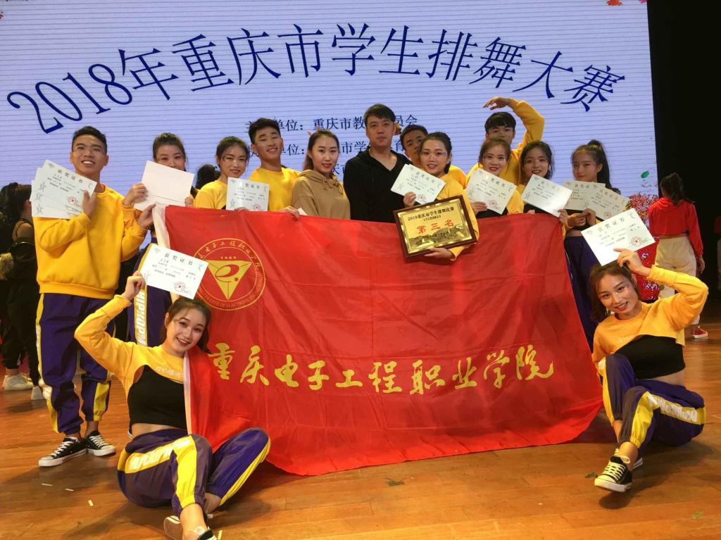 我校排舞代表队由体育与国防教学部副部长徐然领队,主教练彭天娥老师,教练周盈含老师、刘博源老师带队参加,经过激烈角逐,我校啦啦队最终荣获2018重庆市大学生排舞比赛团体第三名的成绩。