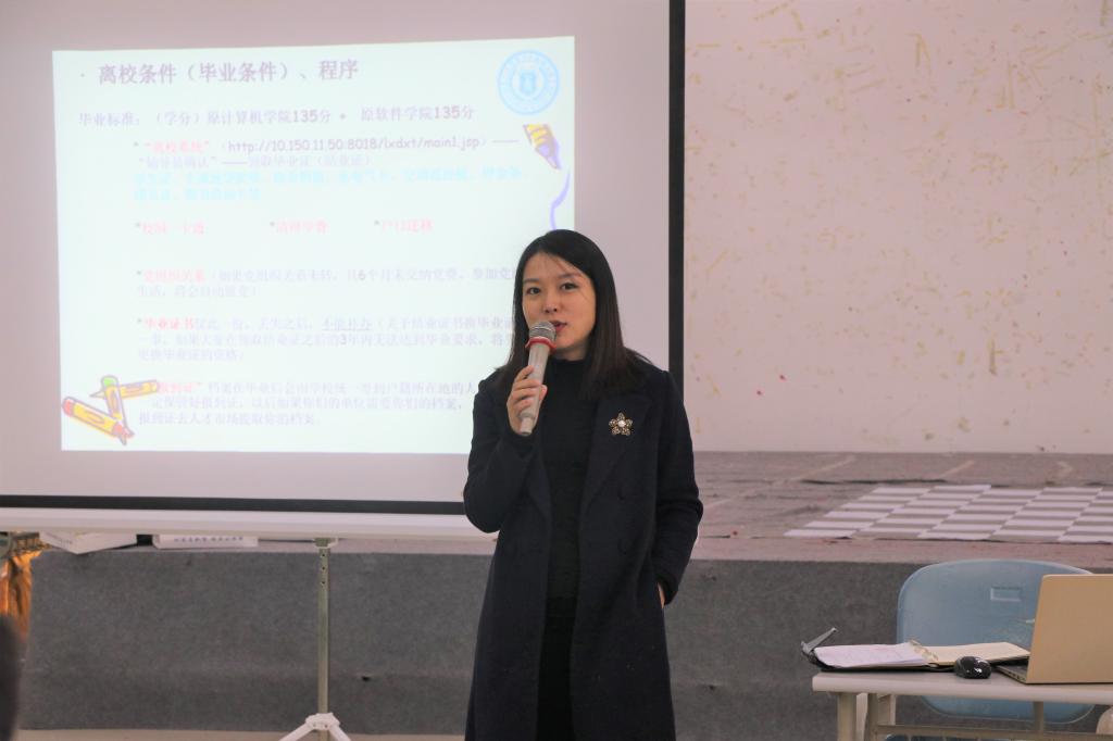 另外,黄婧雯老师从离校程序、就业指导、母校认同等方面为毕业生进行了详细讲解,其中包括了当前就业形势、求职技巧、求职心态等各项具体事宜。同时她也介绍了毕业生就业政策,如大学生志愿服务西部计划、“三支一扶”计划、农村义务教育阶段学校教师特设岗位计划、选聘高校毕业生到村任职工作、应征入伍等。黄老师用丰富的经验和生动的例子提醒大家在找工作过程中既不能好高骛远也不要妄自菲薄。老师们耐心讲解,毕业生们用心聆听,收获颇丰。