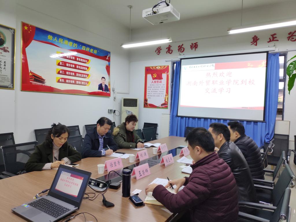 2018年12月5日上午,湖南外贸职业学院科研处处长刘潇、战略发展中心主任余亮开、会计学院党总支书记任碧芳到我校就大思政格局的构建、“十大育人”的做法、校园文化建设以及思政课建设考察交流。马克思主义学院党总支书记黄正伟、马克思主义学院副院长冉鑫、科研与社会服务处副处长王荣辉做了热情接待。