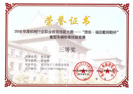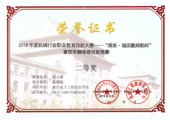 12月21日,为期两天的2018年度全国机械行业职业教育技能大赛——重型车辆维修(技术)项目竞赛在山东交通技师学院圆满落幕。经过为期两天的激烈角逐,我校智能制造与汽车学院汽车检测与维修技术专业学生程小林、肖志强凭借精湛的技艺,分别荣获重型车辆维修(技术)项目二等奖和三等奖。