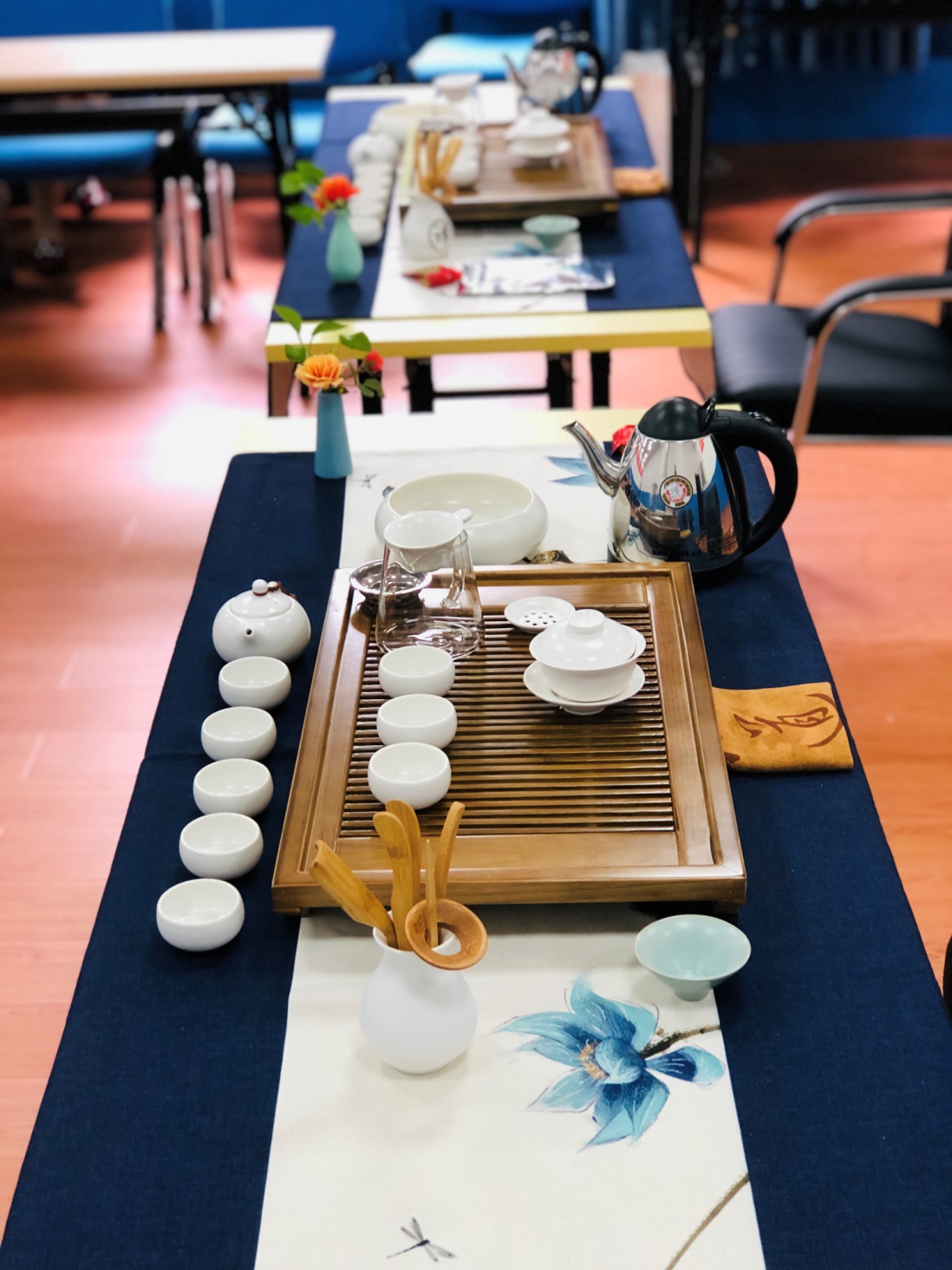唯美幽远的古筝乐曲中,活动拉开帷幕,杨梅、吴雪莎、李娇娜、丁瑶、袁娜、罗巧玲老师首先向留学生介绍源远流长、博大精深的中国茶文化,展示了中华民族悠久的文化和灿烂的文明;随后通过品环境之雅,赏茶具之美,辨茶叶之香,以及邀请留学生参与茶类分辨,让留学生感受到了茶中所蕴含的艺术之美、人生之道。接着,老师们进行了精湛的茶艺展示,由赏茶、闻茶、沏茶、品茶一系列和美仪式,传播了中华美学和礼仪。