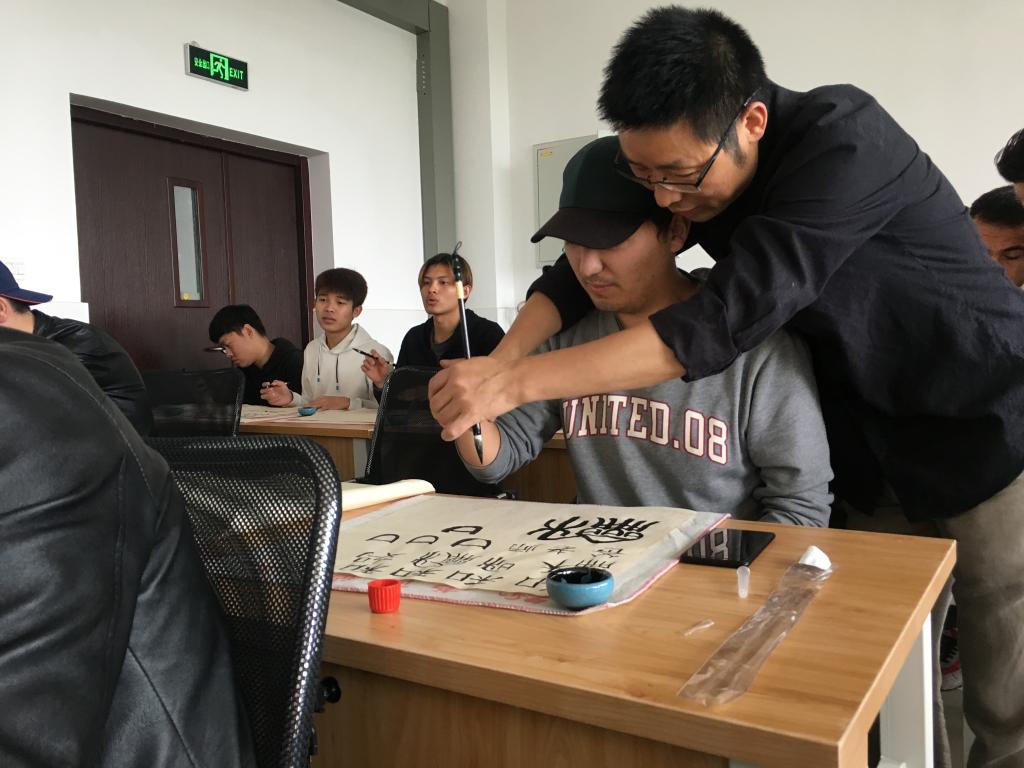 范永富老师从中国古代汉字的起源开始,讲解了书法的发展历程、五种书体、毛笔的制作材料、握笔姿势和汉字基本笔画的书写方法。在本次书法体验课上,范老师以“和”字为例,围绕“和”字的构造、内涵意义,书写规范,手把手教留学生进行他们的第一次书法体验。留学生们是第一次接触书法,范老师从握笔、蘸墨、运笔、笔顺,一一指导,留学生们非常兴奋,拿着自己亲手书写的“和”字,开心地说:“我第一次写书法,很喜欢中国书法”。