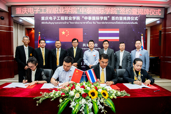 首先校党委书记孙卫平先生致欢迎辞,对各位领导嘉宾的到来表示欢迎。他表示,重庆电子工程职业学院作为中国100所国家示范性高等职业院校之一,拥有悠久的办学传统和优秀的师资条件。五年来,学校认真贯彻中国教育部印发的《推进共建“一带一路”教育行动》要求,积极实践“走出去”和“引进来”的职业教育开放办学理念,紧跟新时代职业教育步伐,加快了国际化办学进程。“中泰国际学院”就是学校主动融入、创新实践国家“一带一路”倡议的具体行动。孙卫平指出,国际化办学对于职业教育的发展,是机遇、也是挑战,更是责任。中泰双方有信心把该学院打造成一个集人才培养、高端培训、成果孵化等功能的国际化平台。随后重庆电子工程职业学院“中泰国际学院”签约暨揭牌仪式举行。