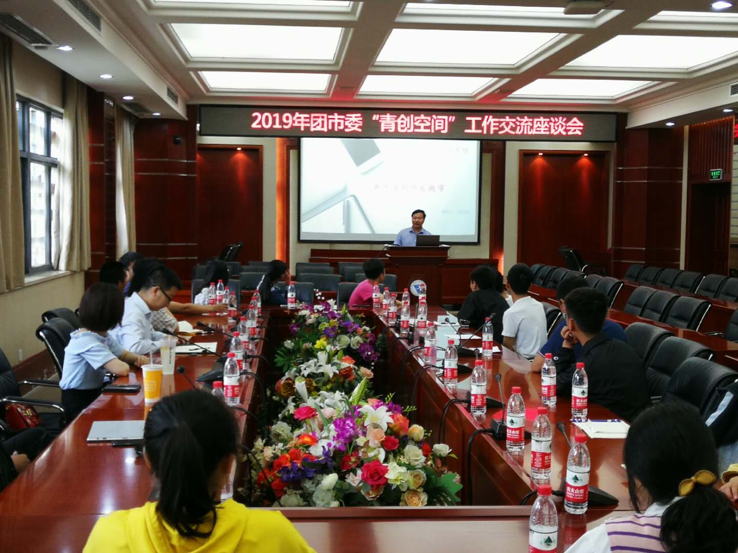 随后在博润厅举行座谈,首先团市委和学校就体制机制、服务平台等相关政策给企业和学生进行了宣讲;然后由3家企业代表给与会人员对各自企业发展及加盟合作方式进行了路演;随后创业学生代表向团市委、企业代表、学校提出关于在创业和创新技能大赛中存在的问题进行咨询,企业代表曾一度被学生的问题密集式“轰炸”,座谈会持续一个半小时,会场气氛热烈。