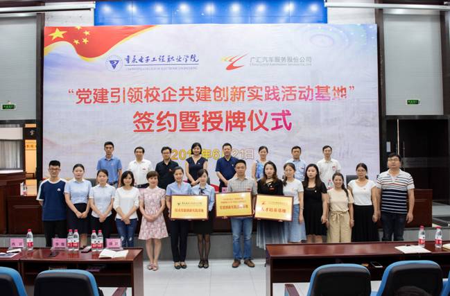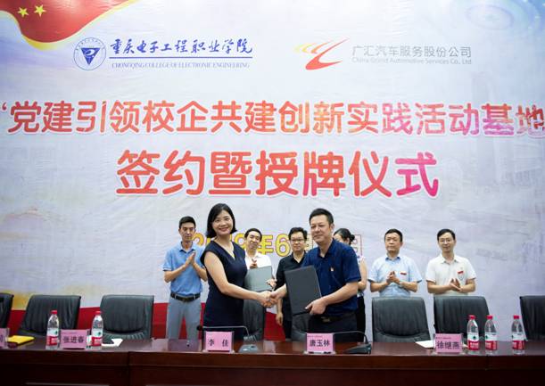 为深学悟透笃行习近平新时代中国特色社会主义思想,全面贯彻落实新时代党的建设总要求以及全国教育大会、全国组织工作会议和全国宣传思想工作会议精神,不断探索党建工作新思路、新模式。重庆电子工程职业学院与广汇汽车服务股份公司西南大区双方经友好协商,确定为“党建引领校企共建”协作单位。2019年6月21日下午2点,“党建引领校企共建创新实践活动基地”签约暨授牌仪式在博远厅顺利举行。广汇汽车(西南大区)党委书记、人力行政总监李佳一行7人,学校党委副书记唐玉林、组织统战部副部长徐继燕、国际交流与合作发展处处长莫绍强出席签约仪式,会议由学院党总支书记罗永前主持。
