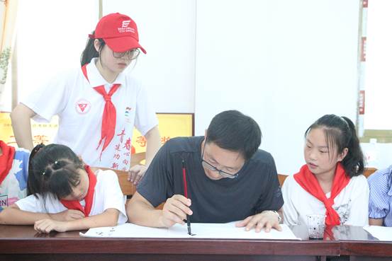 紧接着,指导老师吴梁洲和志愿者们一起手把手教小朋友们学习书法,教小朋友们握笔,一笔一画书写,体味中国传统文化之美,在书写过程中找到乐趣。